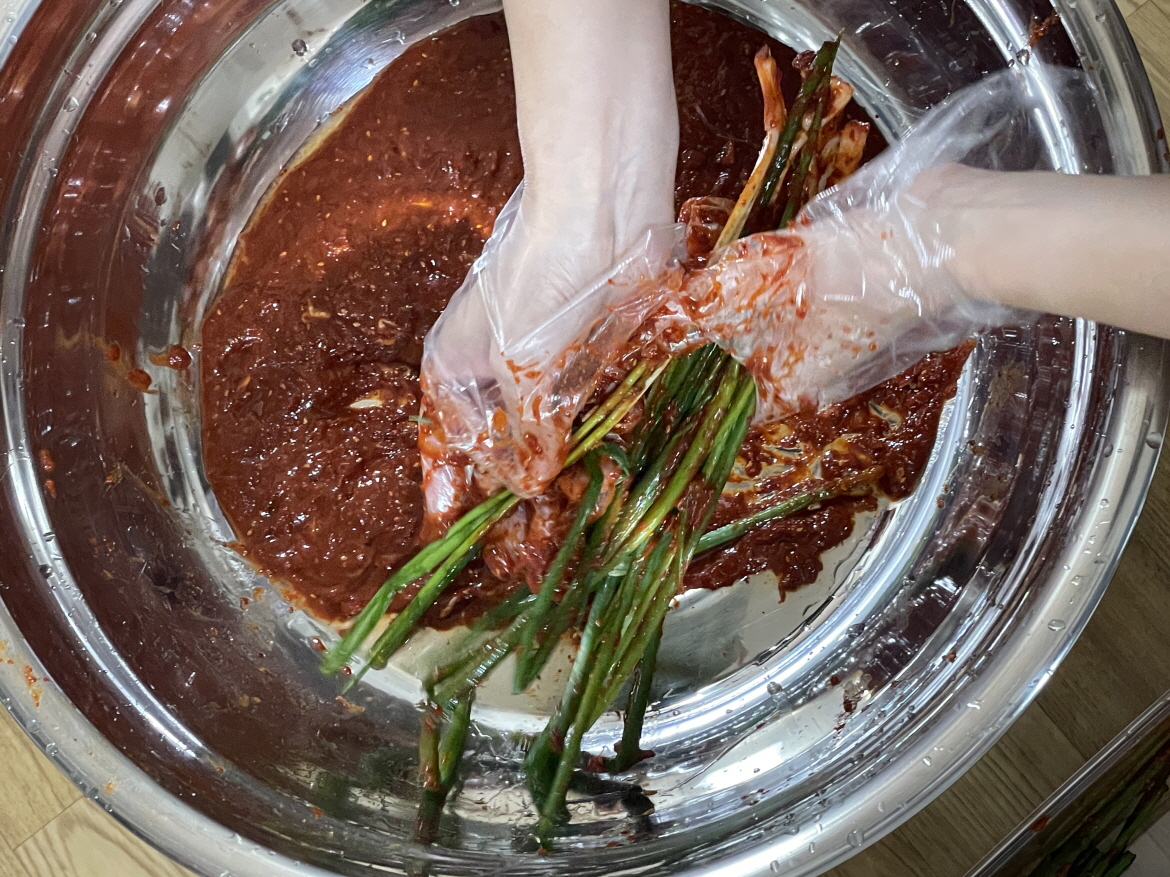 9 쪽파를 한 손에 잡힐 만큼 잡고 양념을 골고루 발라줍니다.