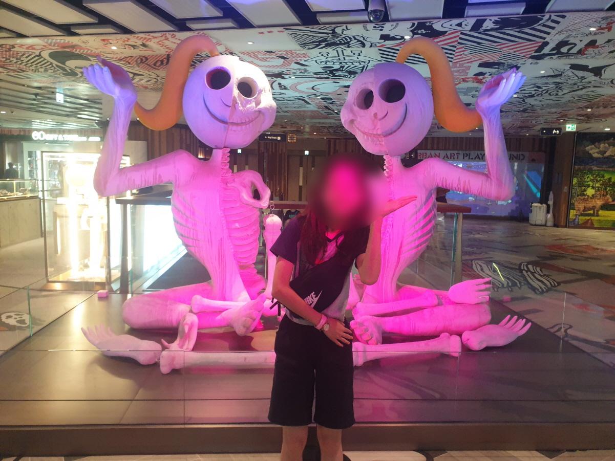 K11 뮤제아에 들어서면 엄청난 규모에 놀라게 되는데요. 스털링 루비, 필리다 발로우, 존 발데사리 등 세계적인 예술가의 작품들이 전시되어 있고 럭셔리 브랜드 명품 매장도 규모가 크네요. 우주와 미래적인 중앙의 골드볼이 눈에 띄고 1800여개의 크리스탈 조명이 화려하게 장식되어 있어요.