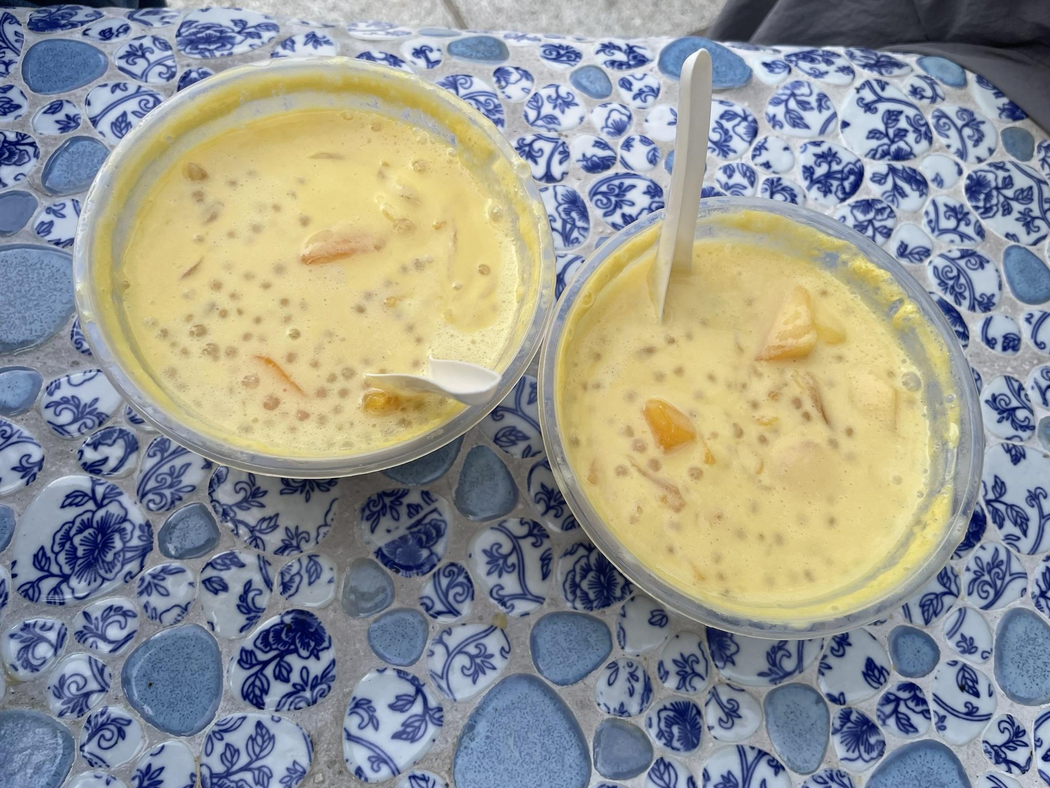 이게 생긴 건 이래도 정말 맛있거든요. 망고 과일의 풍미와 사고펄의 쫄깃함, 그리고 코코넛 밀크의 고소하고 부드러움이 어우러지는 맛이에요.