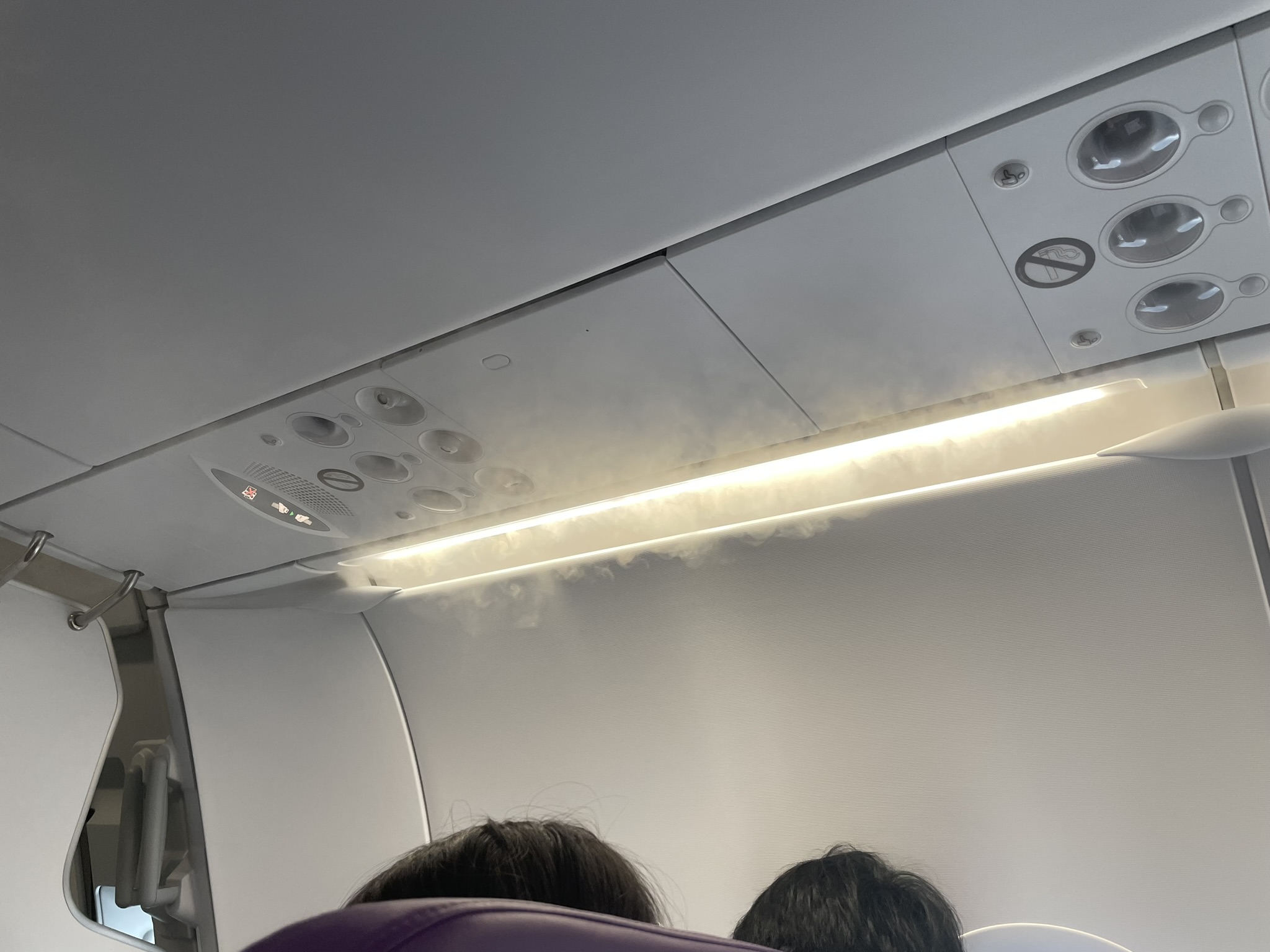 비행기 기내에서 보이는 안개, 연기, 가습기 같은 기체, 왜 생길까요? 동영상 첨부