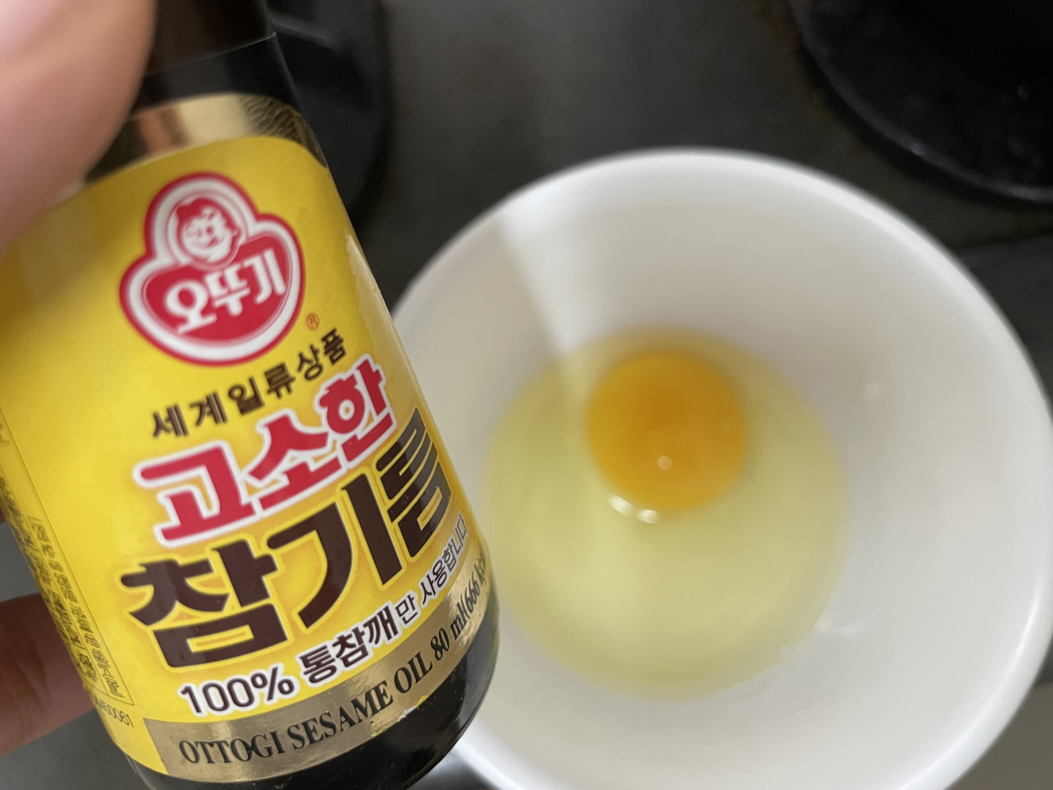 5 다른 그릇에 계란 1개와 참기름 1스픈 넣고 풀어서 준비합니다.