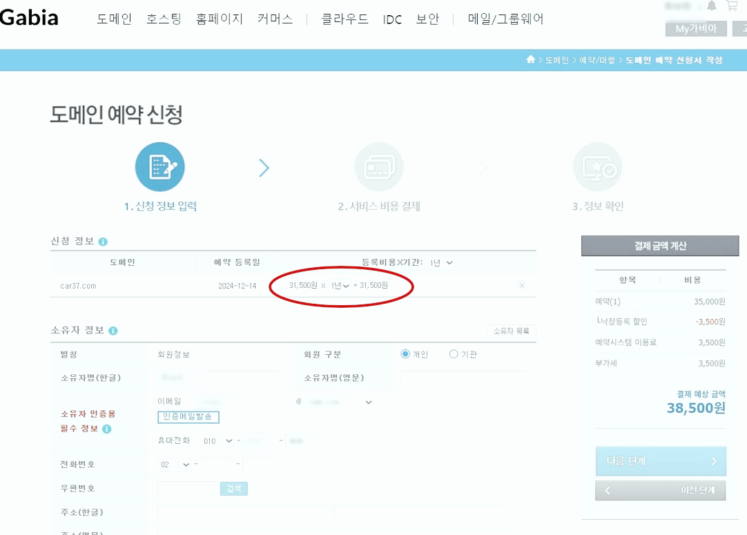 도메인 비용은 1년에 31,500원이네요. 생각보다 많이 비싸지는 않은 것 같아요.
