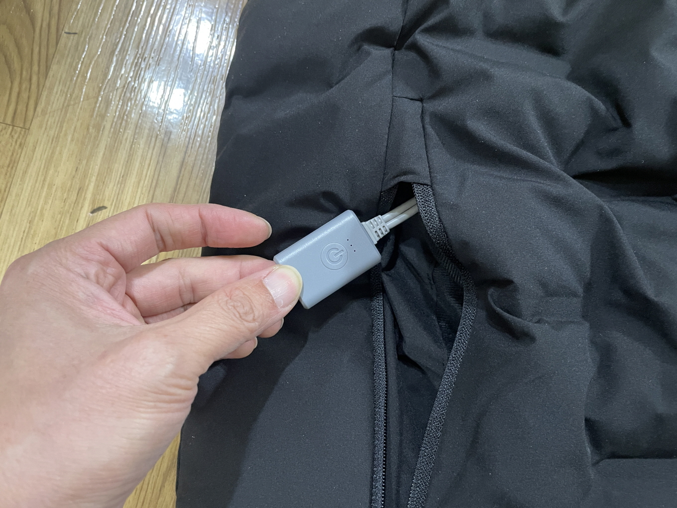안쪽 주머니에 보조배터리를 넣어 발열패드에 전원을 공급하는 방식.