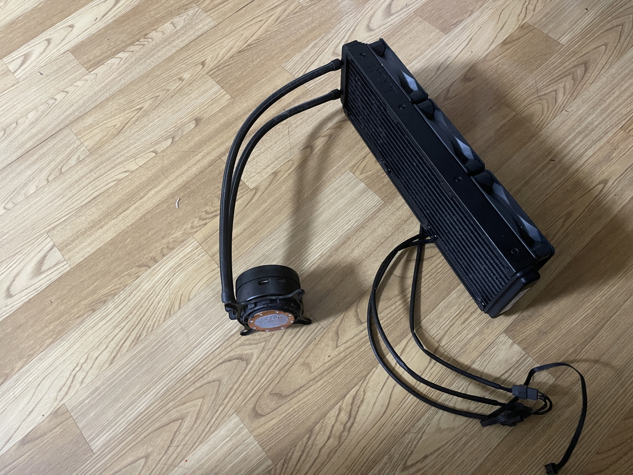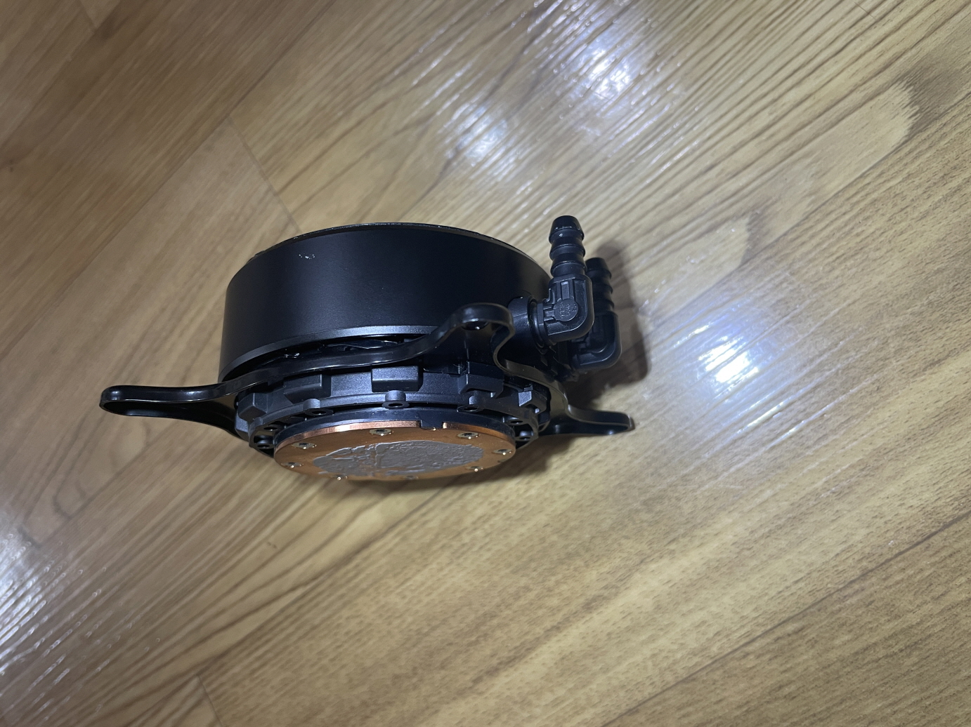 CPU에 장착하는 워터블록과 라디에이터, 팬이 일체형으로 나오는 제품인데요. 워터블럭과 라디에이터가 연결되어 있는 호스는 분리되지 않아요.
