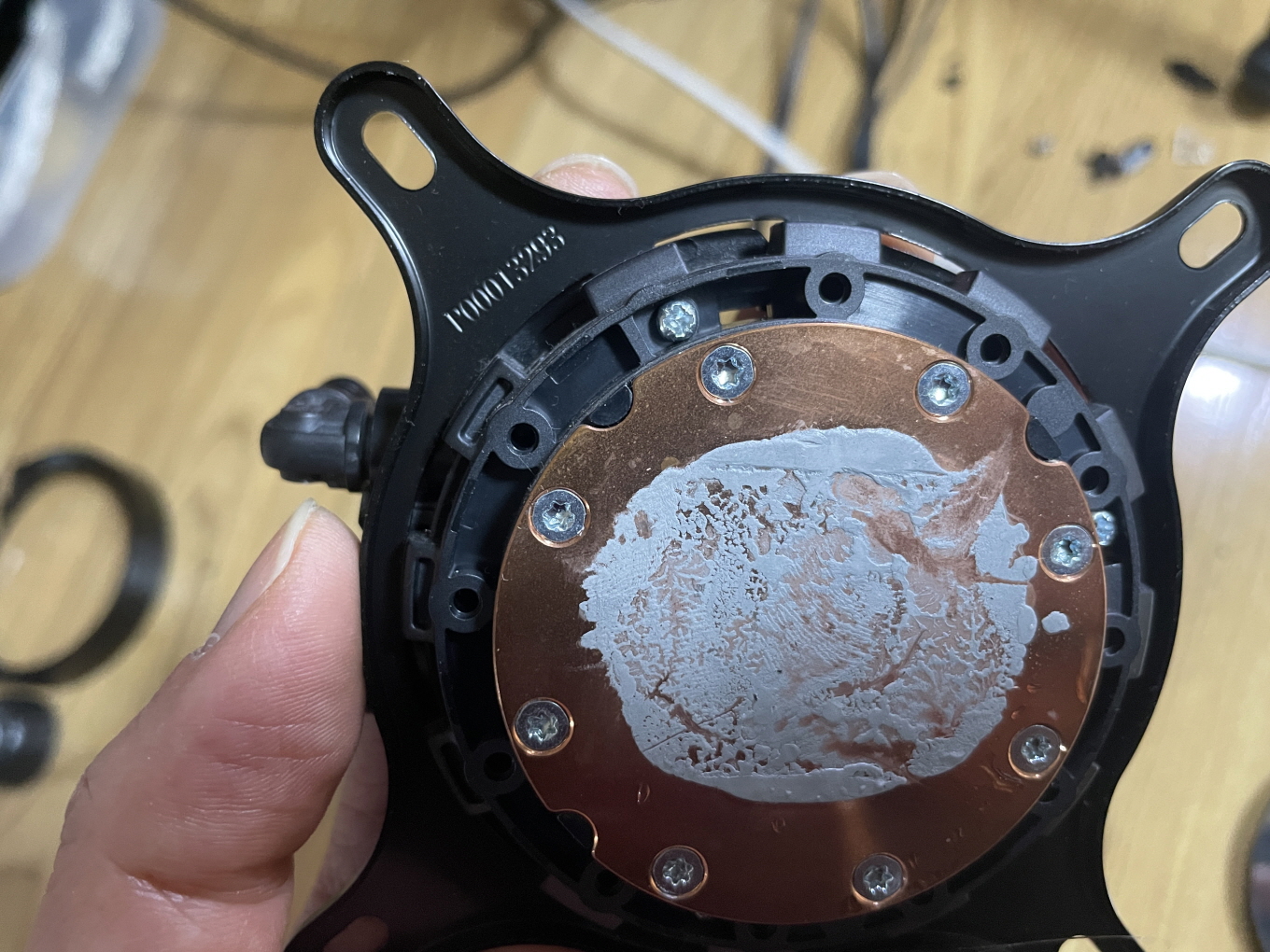 CPU와 접촉되는 구리판 옆으로 작은 피스 3개가 있습니다. 이걸 풀면 워터펌프 위쪽에 있는 커버를 분리할 수 있어요.