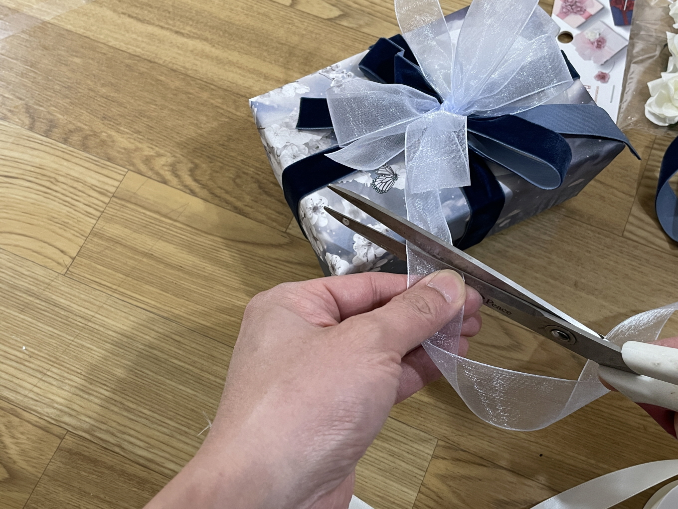 1 우선 가장 어두운 색상의 남색 벨벳리본으로 십자모양의 리본을 한번 묶습니다. 강한 색상으로 전체적으로 한번 묶은 다음 점점 옅은 색으로 추가 리본 장식할 겁니다.