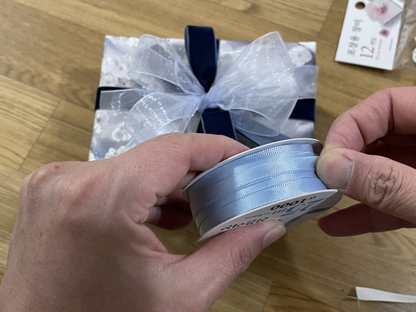포장지 색상에 맞춰서 리본 색상을 구입해야 해요. 다이소에 가서 어울리는 색상의 리본을 구입했습니다.