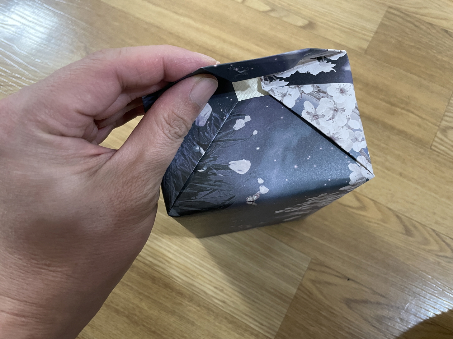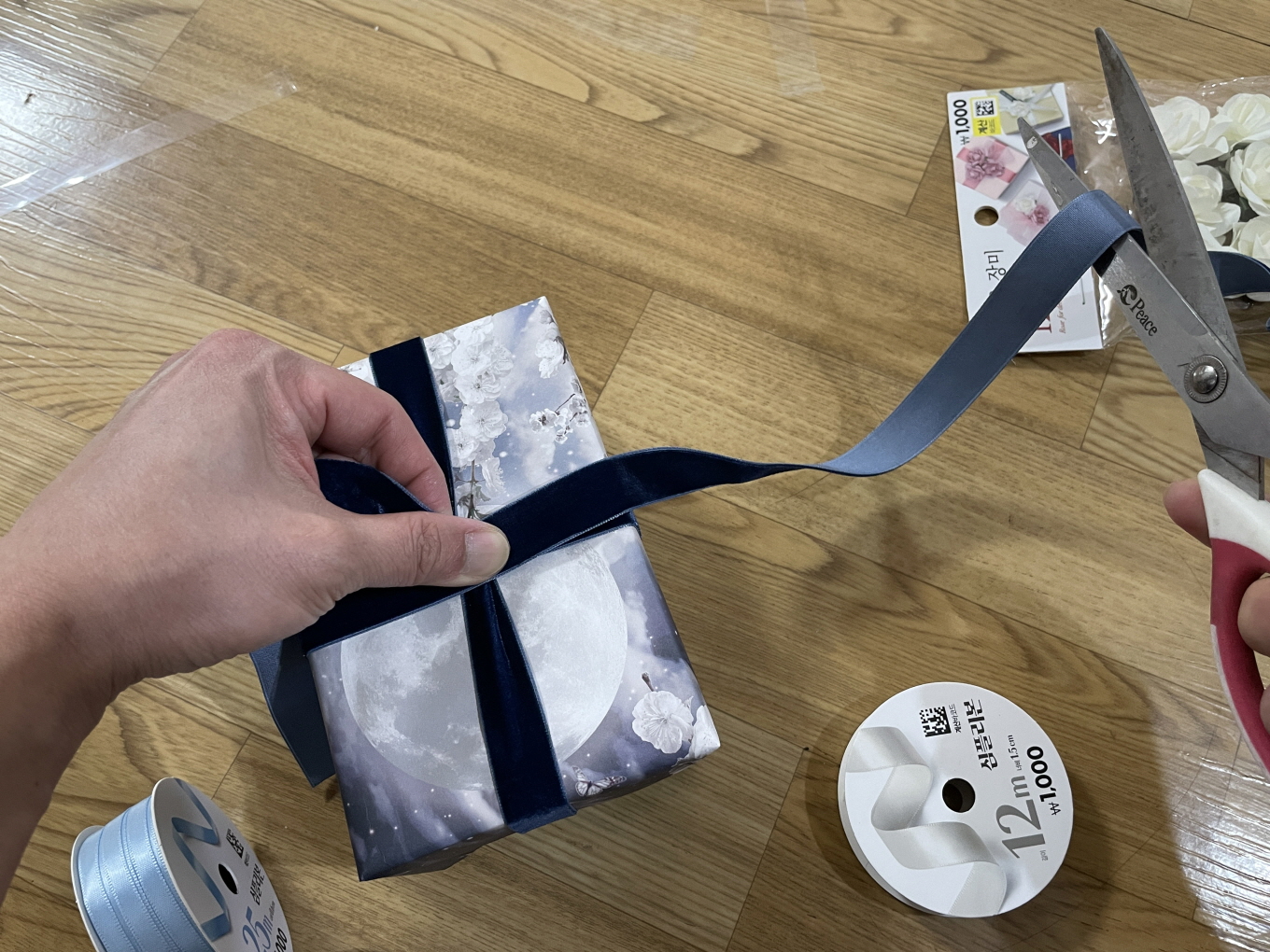 이번에는 파란색? 남색 계열로 포장을 해보려고 해요. 집에 있는 포장지로 보장을 했는데 이런 보름달이 있는 남색계열의 포장지로 포장을 했네요.