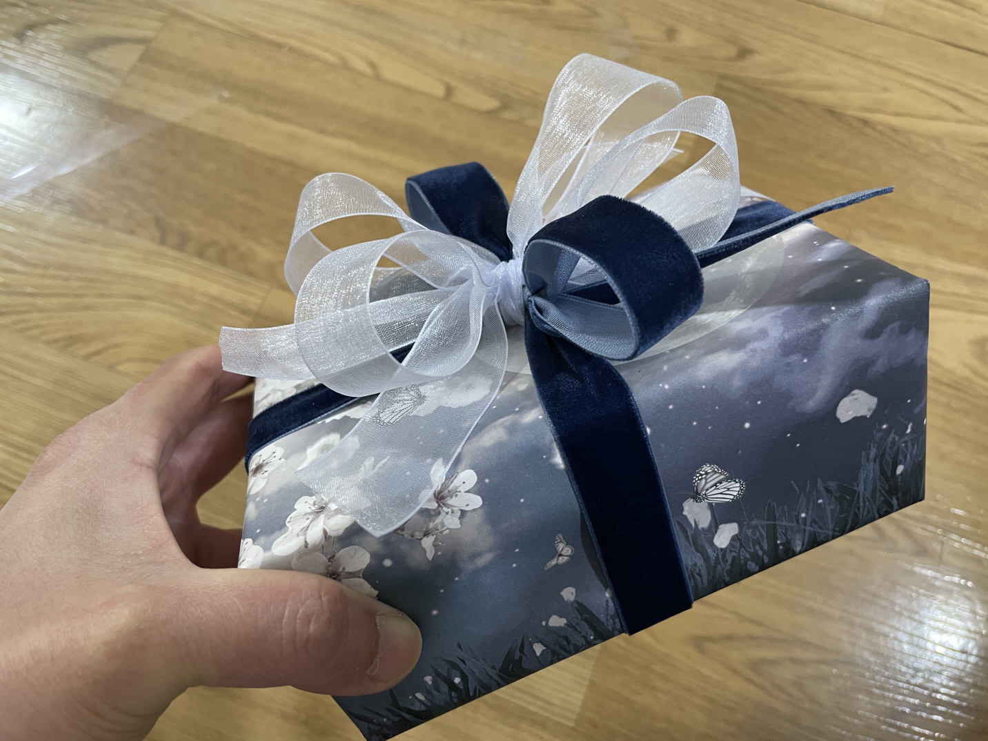 이번에는 파란색? 남색 계열로 포장을 해보려고 해요. 집에 있는 포장지로 보장을 했는데 이런 보름달이 있는 남색계열의 포장지로 포장을 했네요.