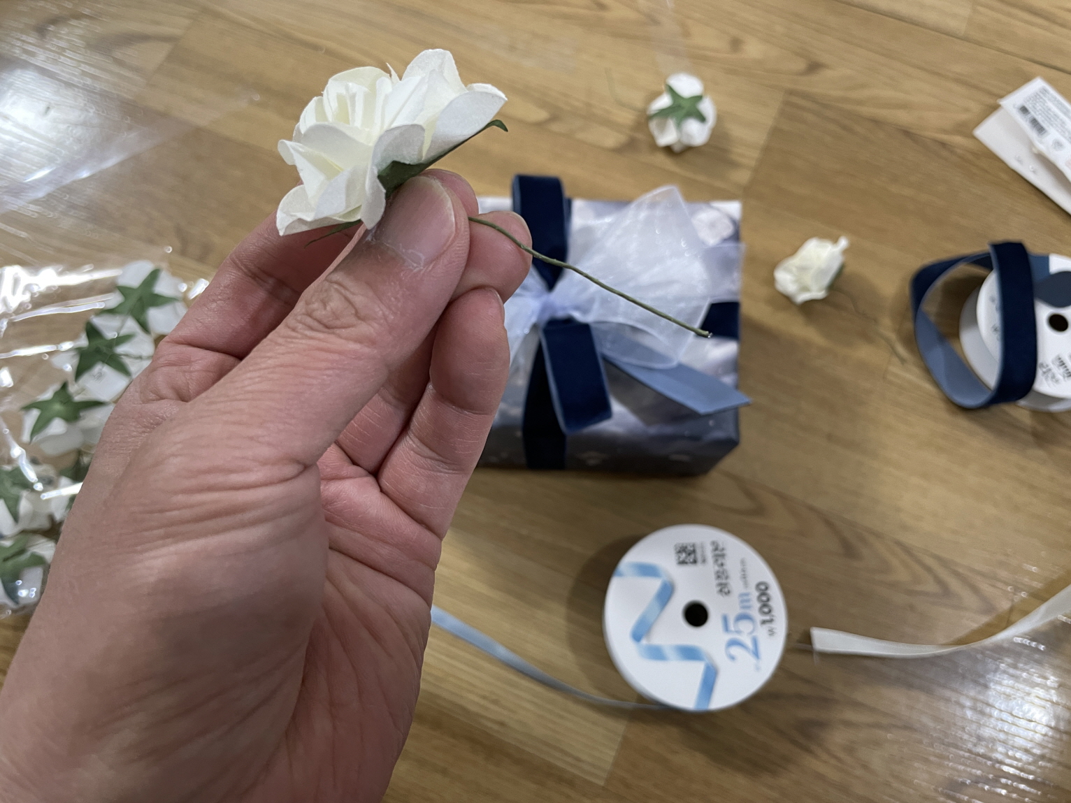 이렇게 구입해서 5천 원어치 사 왔어요. 리본 4 롤에 포인트용 장미 장식을 구입했습니다. 장미는 리본으로 접어서 포인트 장식을 하는데, 이런 장미 장식으로 해도 예쁠 것 같아요.