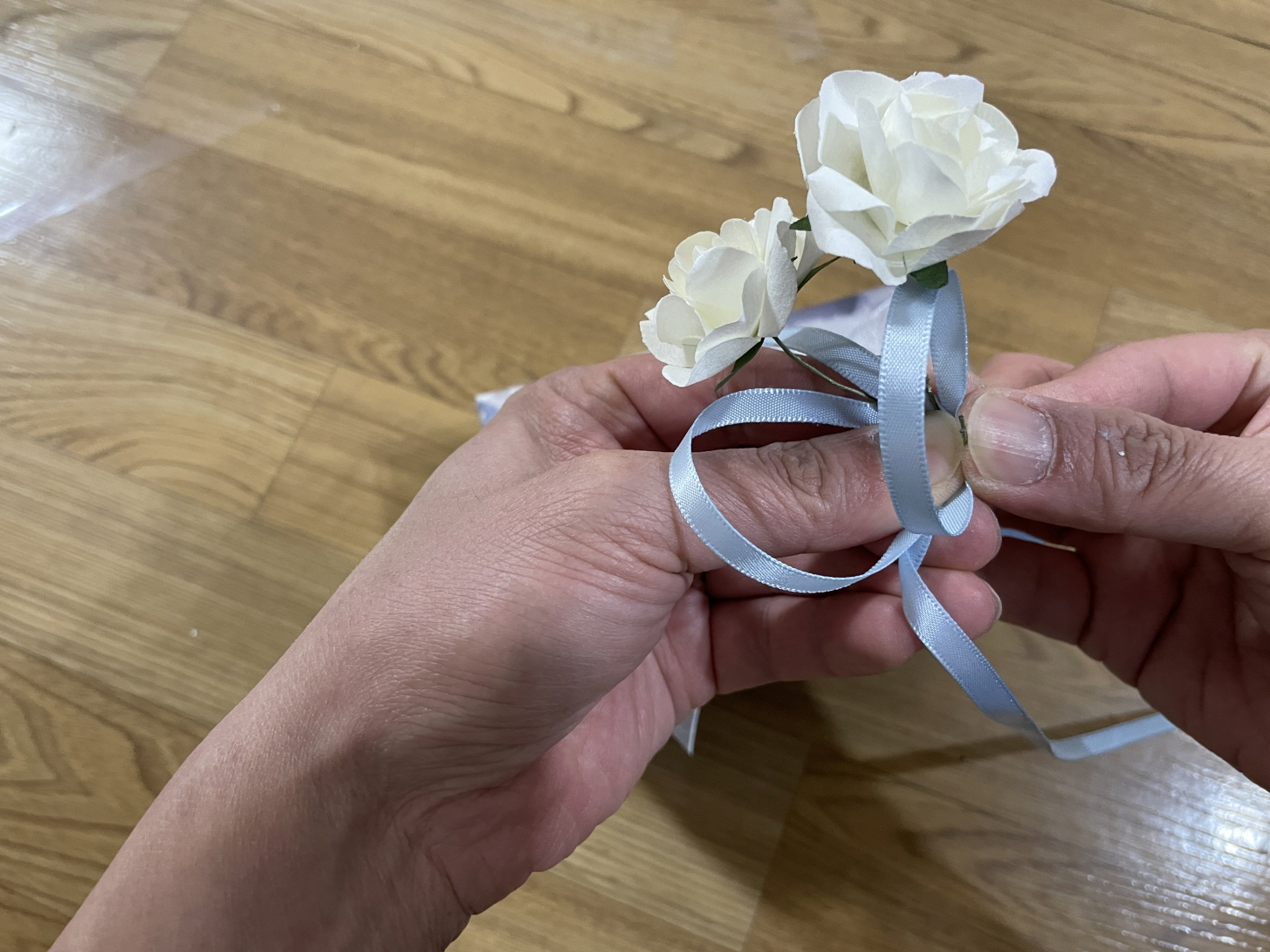 4 화려하게 추가로 포인트를 주려면 가운데 꽃 장식을 합니다. 폭 6mm의 얇은 리본으로 장미 주변을 둘러주고요. 장미 두 송이 정도 글루건을 이용하여 묶어놓은 리본 중앙에 붙여줍니다.