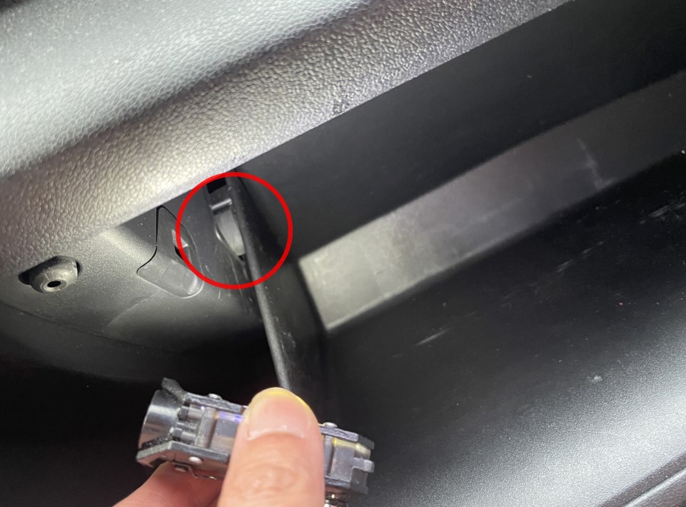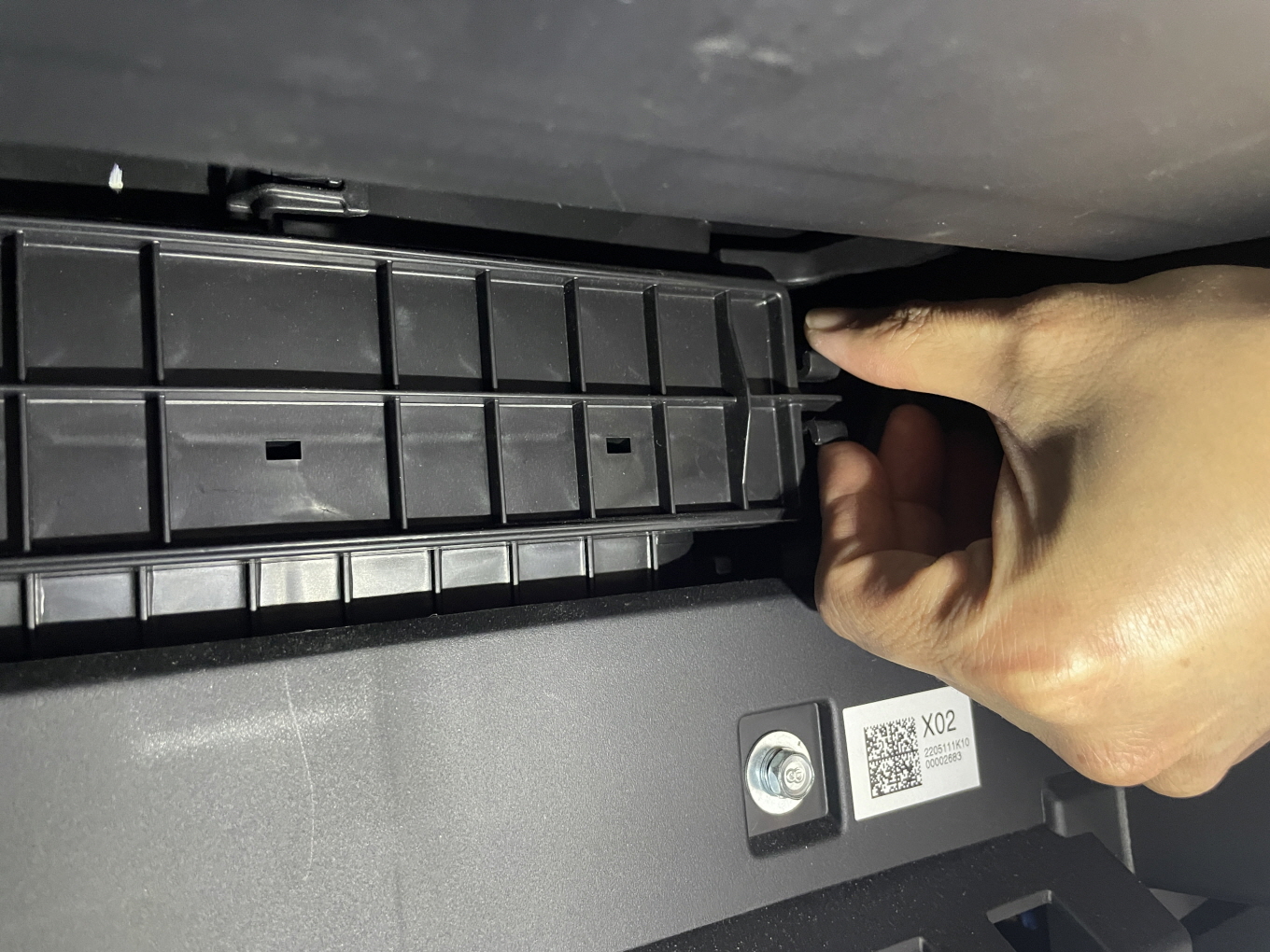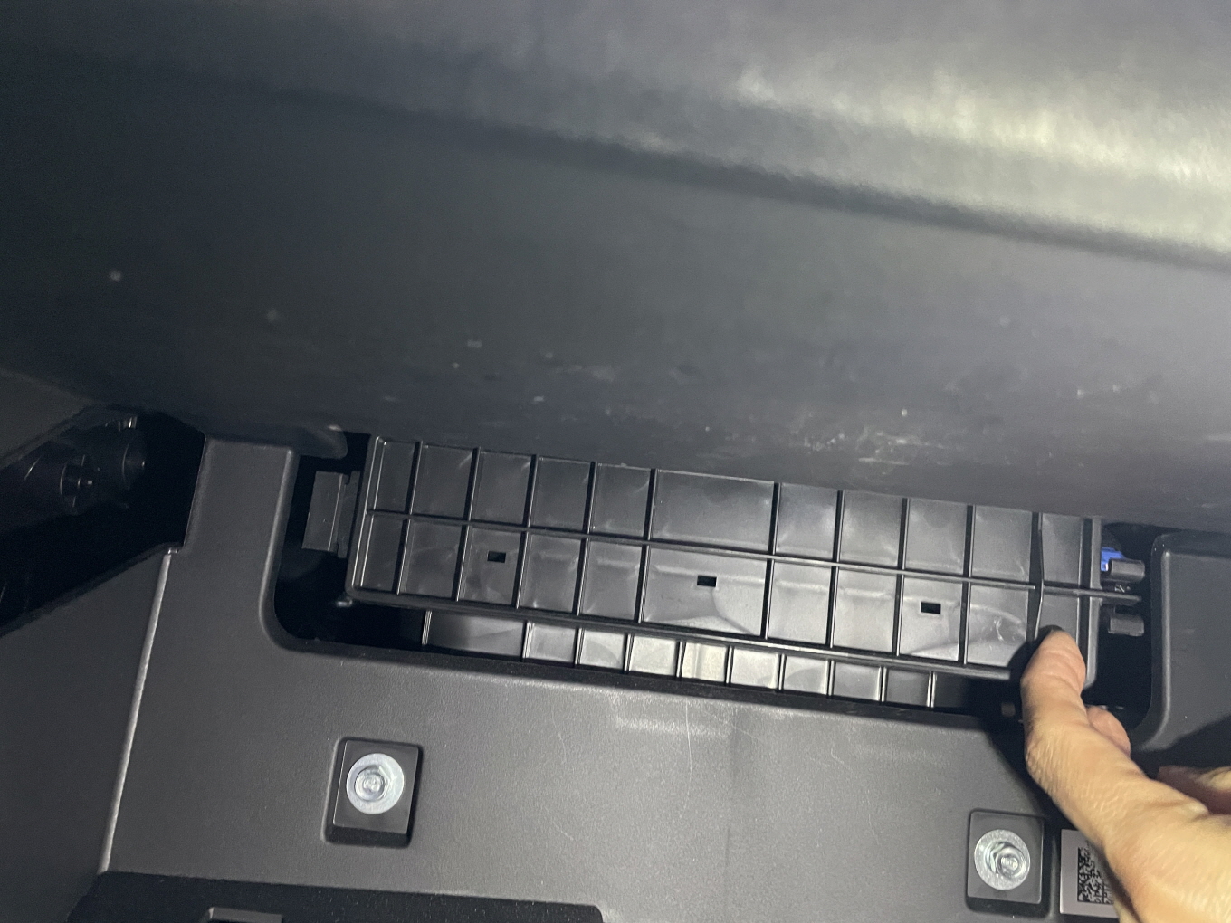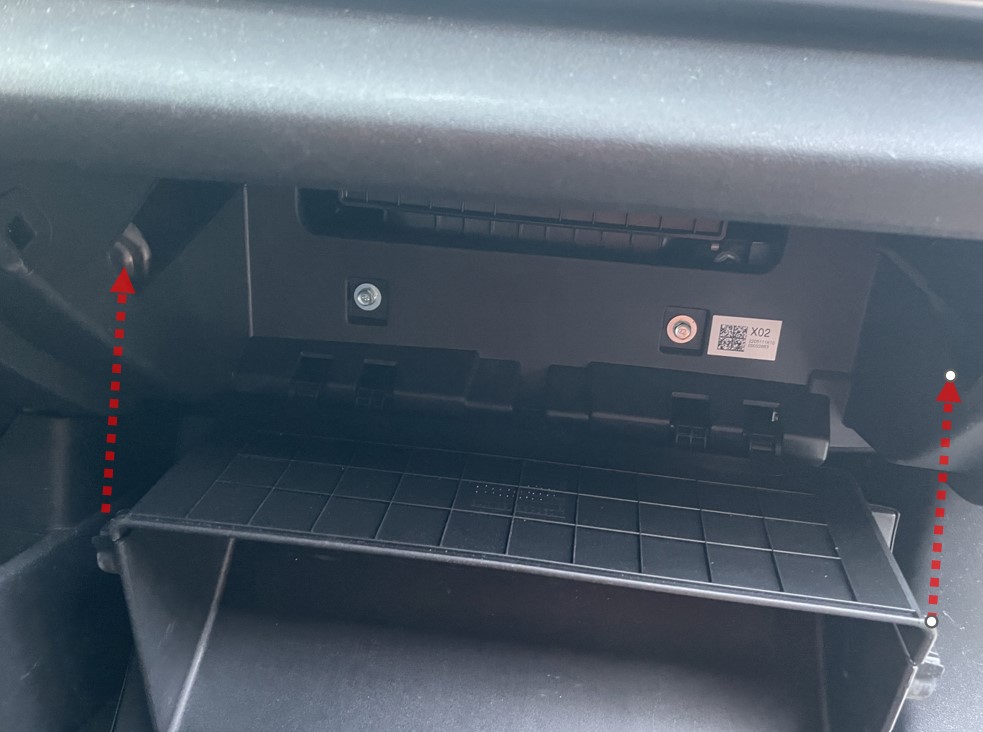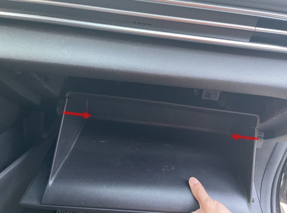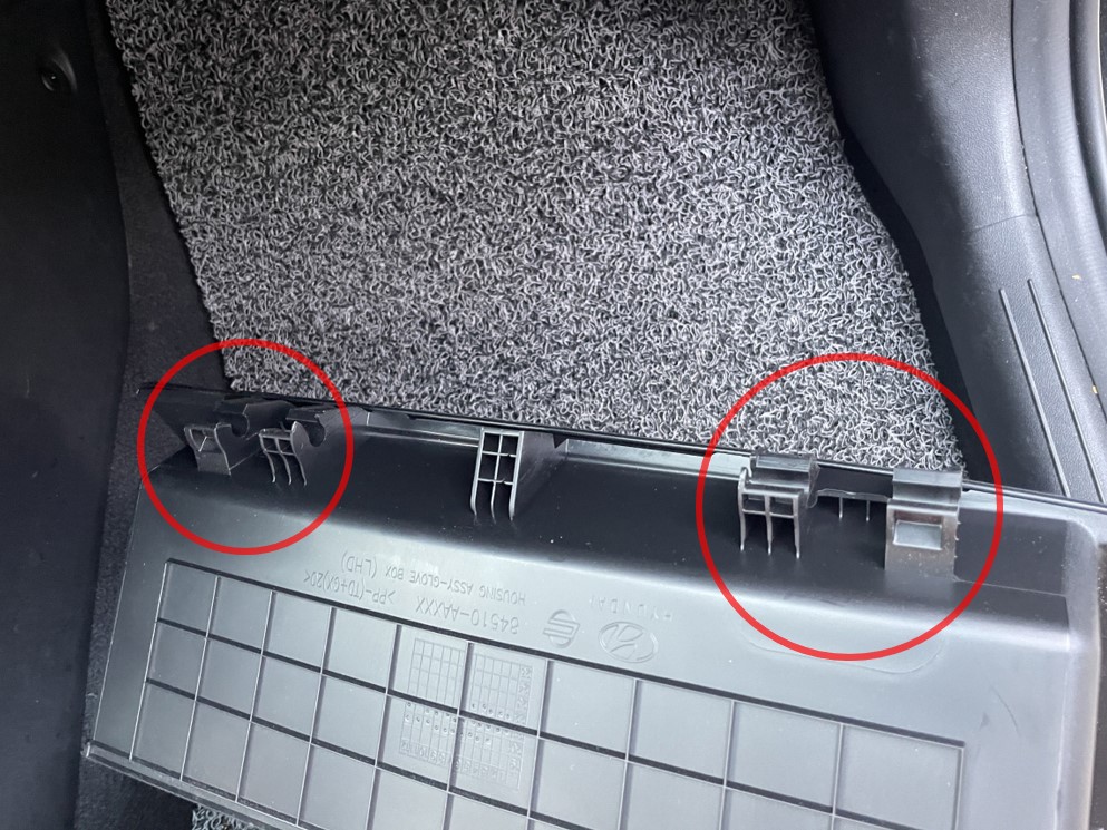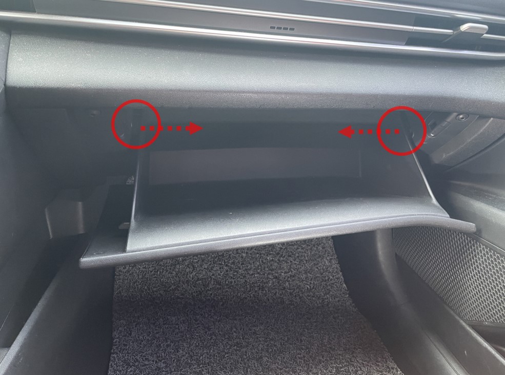 2 글로브박스를 열고 양옆 고정 핀을 안쪽으로 세게 눌러서 분리합니다.