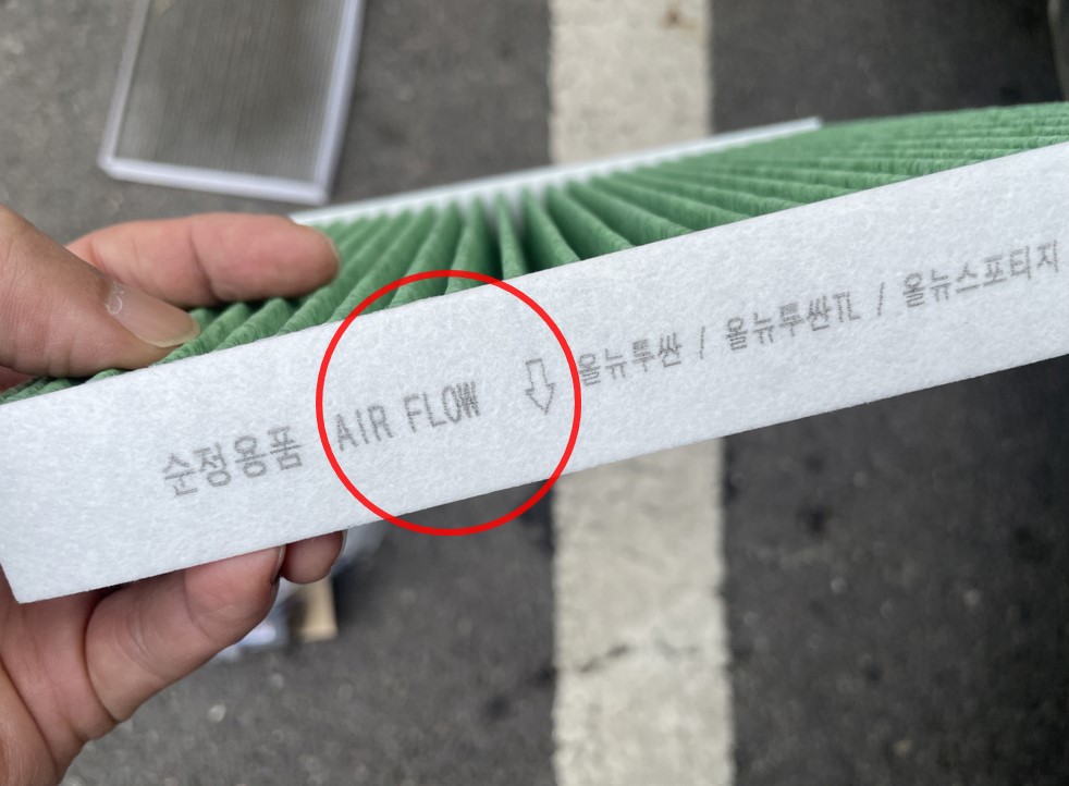 4 기존 필터를 제거 후 새 필터 삽입합니다. 필터에 보면 화살표가 있는데요. 위에서 아래로 바람이 흐르기 때문에 화살표를 위에서 아래 방향으로 향하도록 넣습니다.