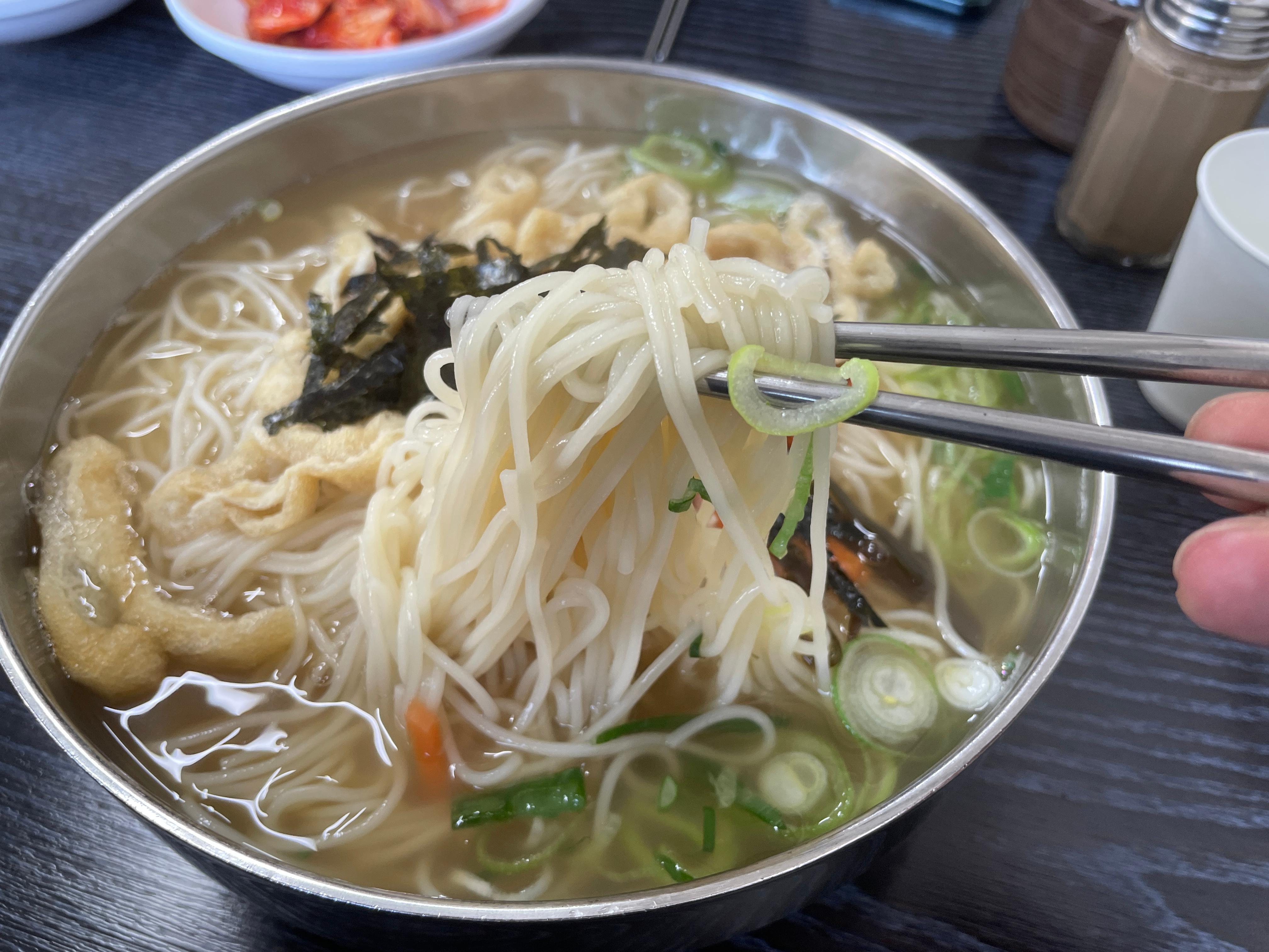 국물이 정말 시원하고 깊은 맛이 났어요. 멸치 베이스인데 잡내도 없고 깔끔한 감칠맛이 일품이었습니다. 위에는 유부, 김가루, 당근, 파가 올려져 있고, 면은 적당히 부드러우면서 쫄깃했어요.
