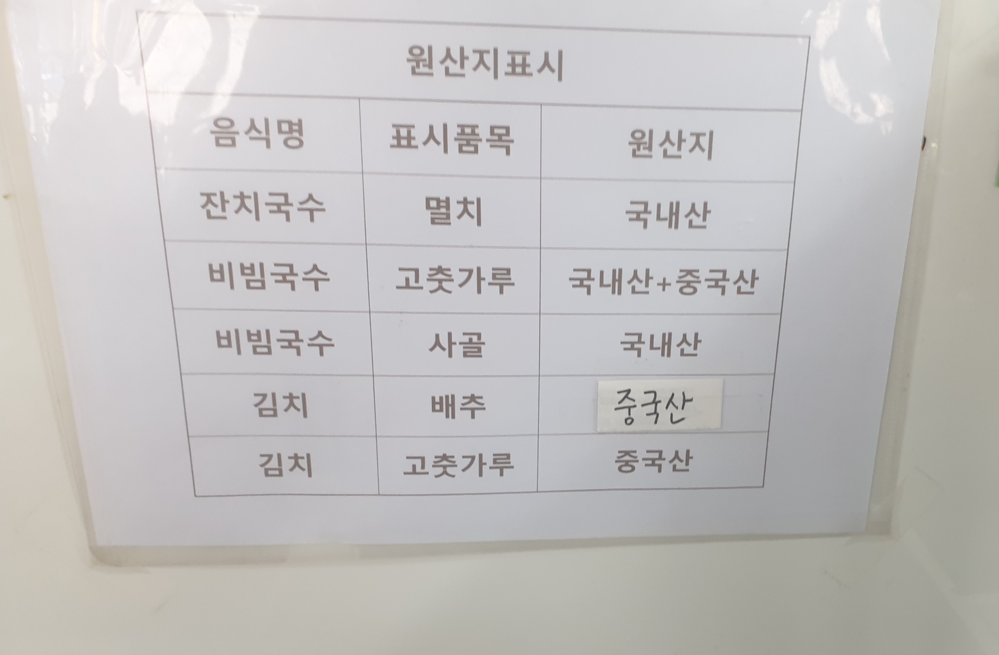 국수에 사용된 멸치는 국내산, 비빔국수에 들어가는 사골도 국내산입니다. 다만 김치에 들어가는 배추와 고춧가루는 중국산으로 표시되어 있으니 참고하세요. 이 부분이 좀 아쉽네요.