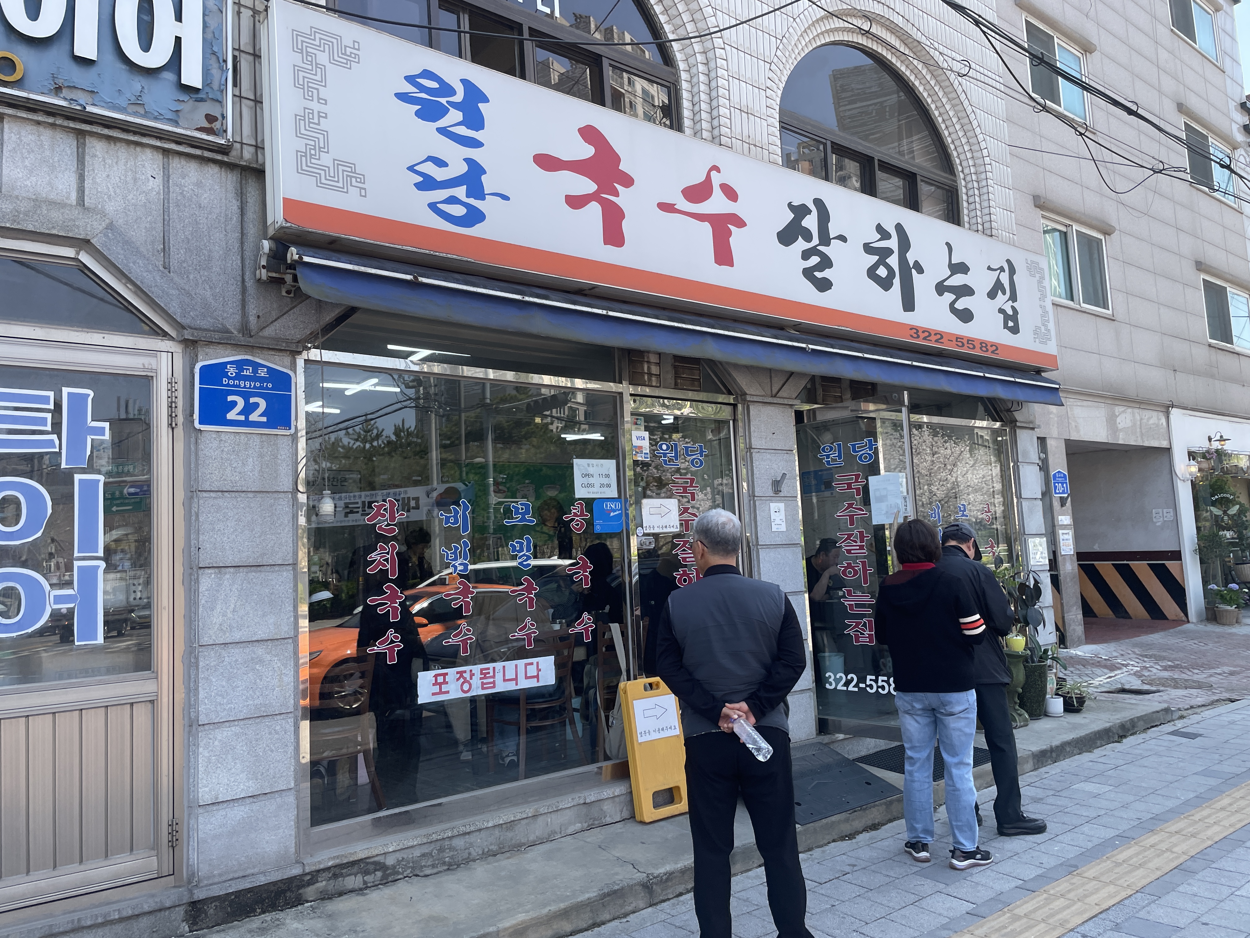 오픈 시간에 맞춰 갔지만 벌써부터 대기줄이 꽤 있었습니다. 이곳은 입소문을 타고 유명해진 국수 전문점인데요, 상호명부터 "국수 잘하는 집"이라 자신감이 느껴집니다.