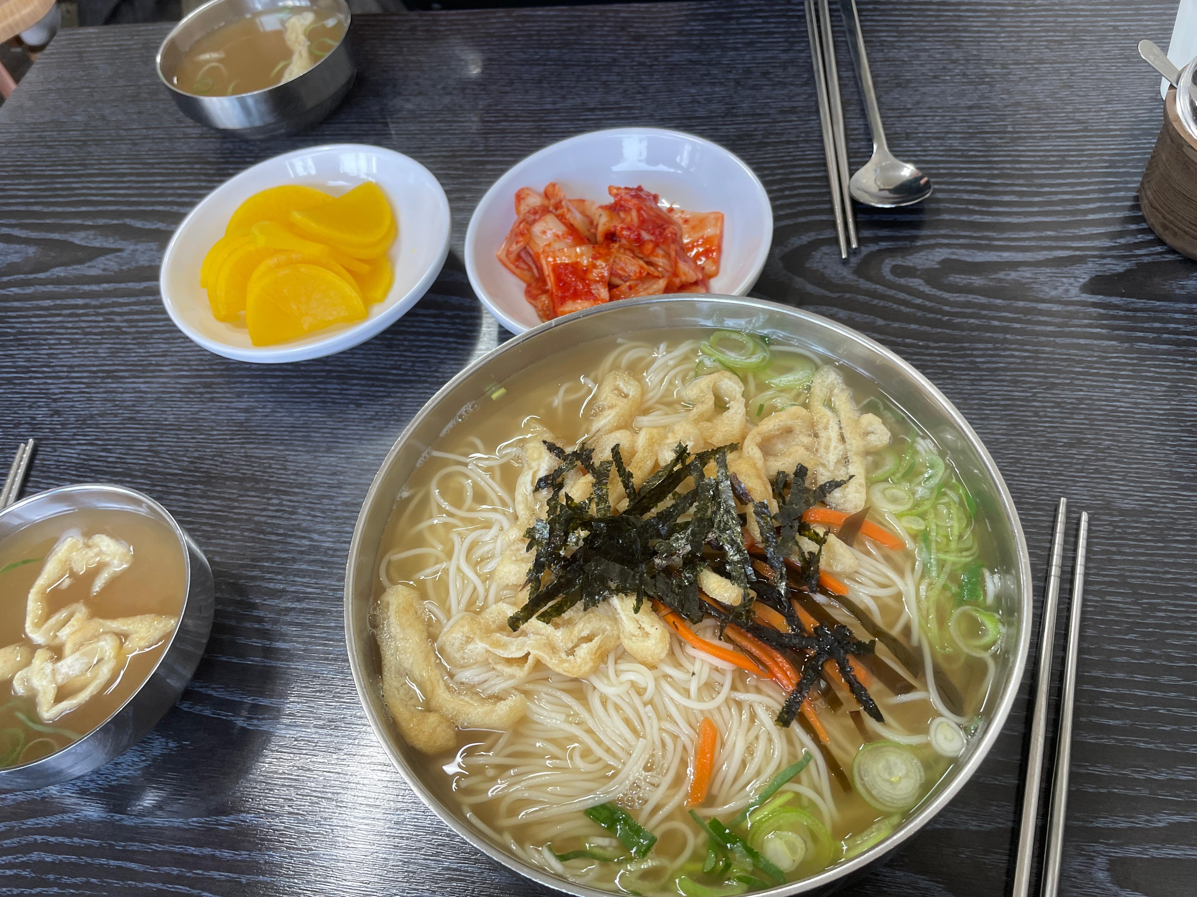 국물이 정말 시원하고 깊은 맛이 났어요. 멸치 베이스인데 잡내도 없고 깔끔한 감칠맛이 일품이었습니다. 위에는 유부, 김가루, 당근, 파가 올려져 있고, 면은 적당히 부드러우면서 쫄깃했어요.
