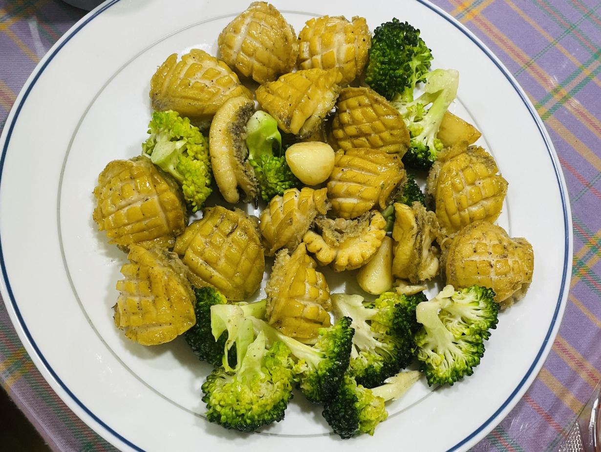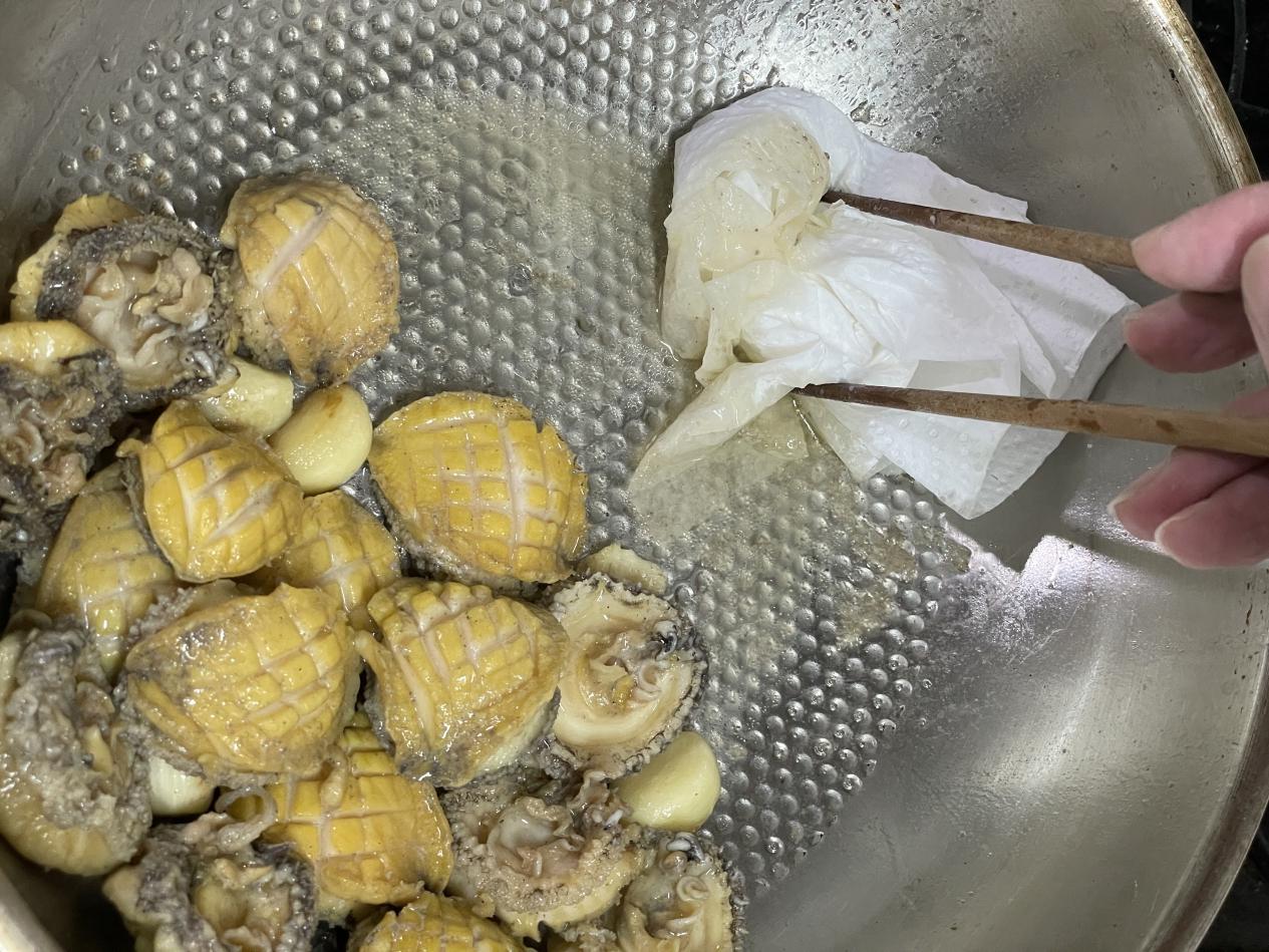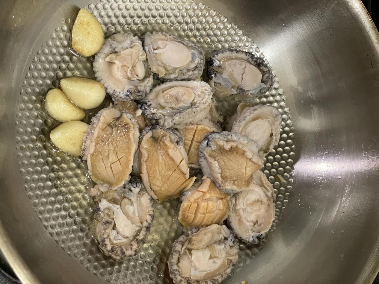 마늘이 노릇노릇해지면 손질된 전복을 넣어 익힙니다. 센 불에 1분 정도 익힙니다.