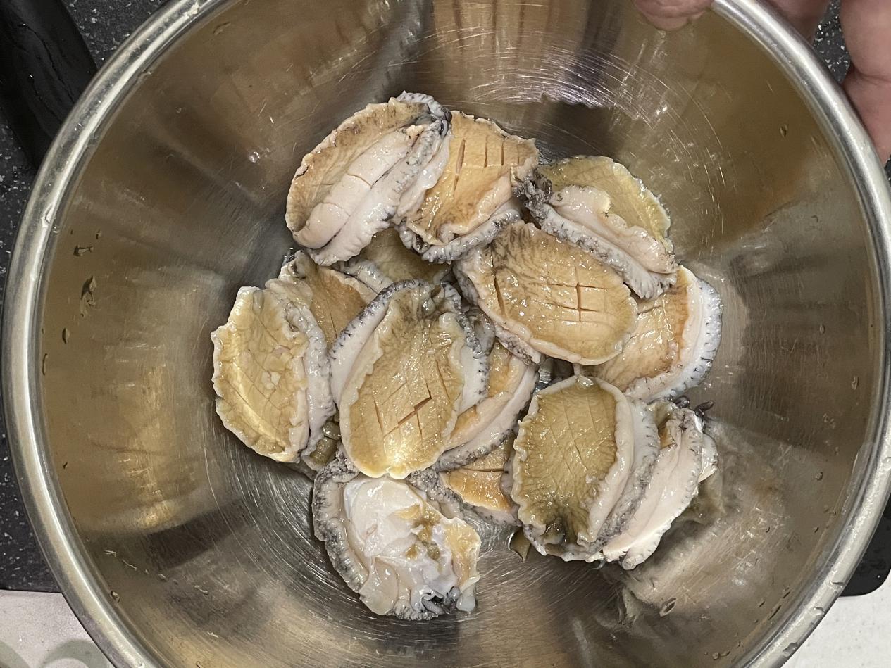 우선 전복의 이물질을 닦아야 해요. 살에 거뭇거뭇한 부분을 다 닦아야 하는데요. 별도의 솔이 없다면 깨끗한 칫솔로 닦아도 괜찮아요. 몇 번만 문질러도 흰 살이 드러납니다. 깨끗이 닦으려 하니까 닦는데 시간이 가장 많이 소요되네요.