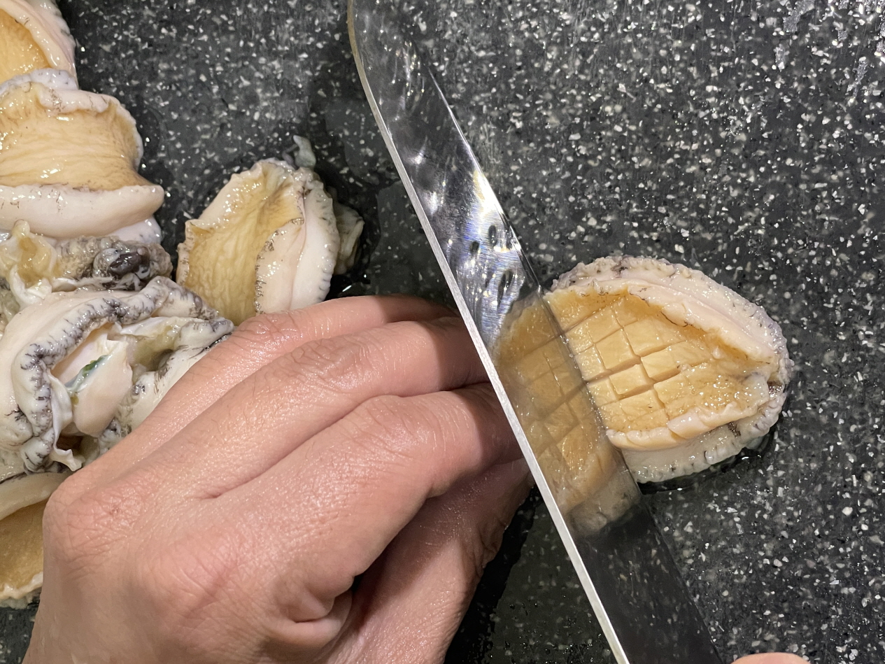 전복에 사선으로 칼집을 냅니다. 이렇게 하면 보기도 좋고 칼집 낸 사이에 버터가 들어가서 버터향이 더 나게 돼요.