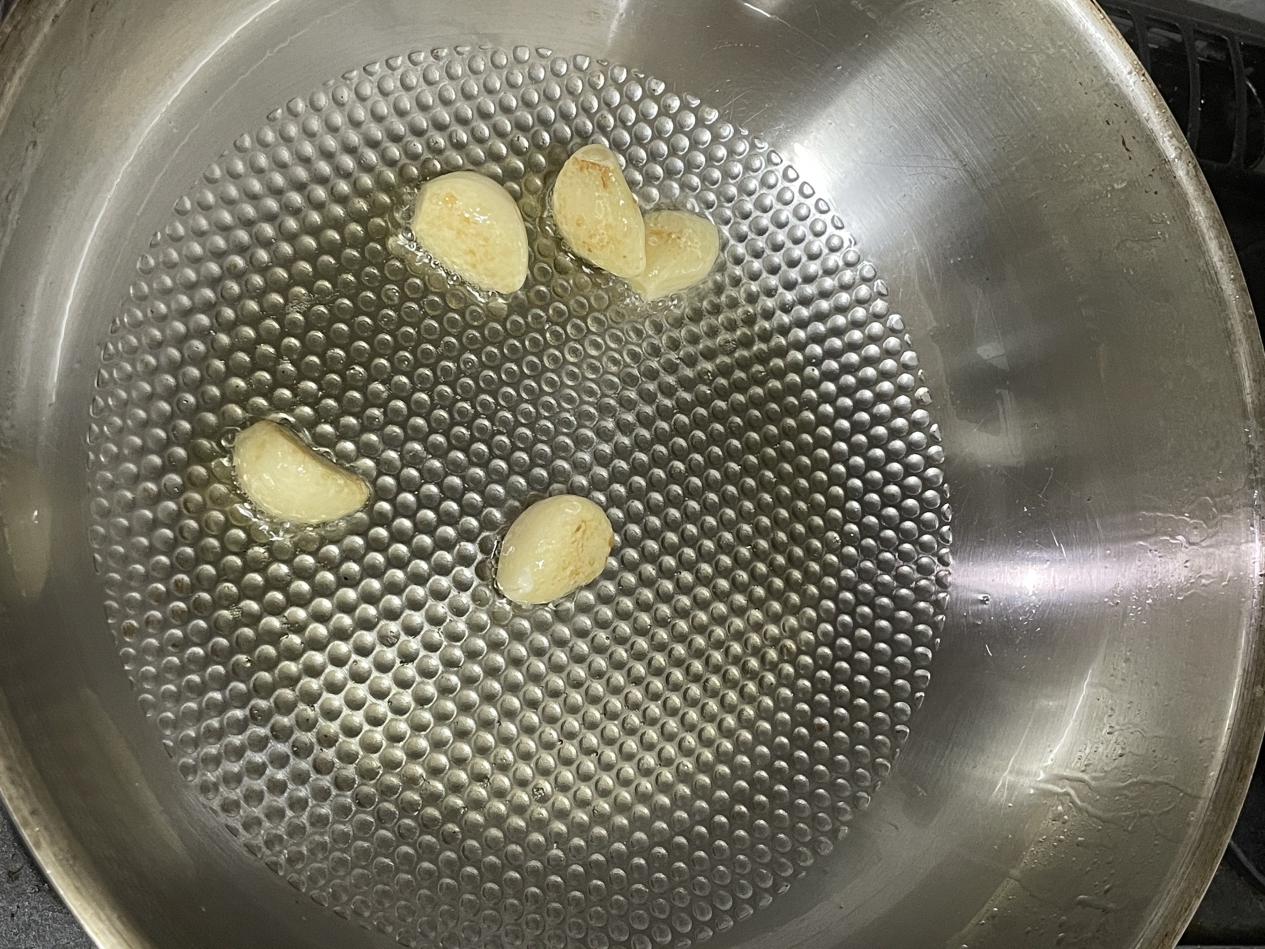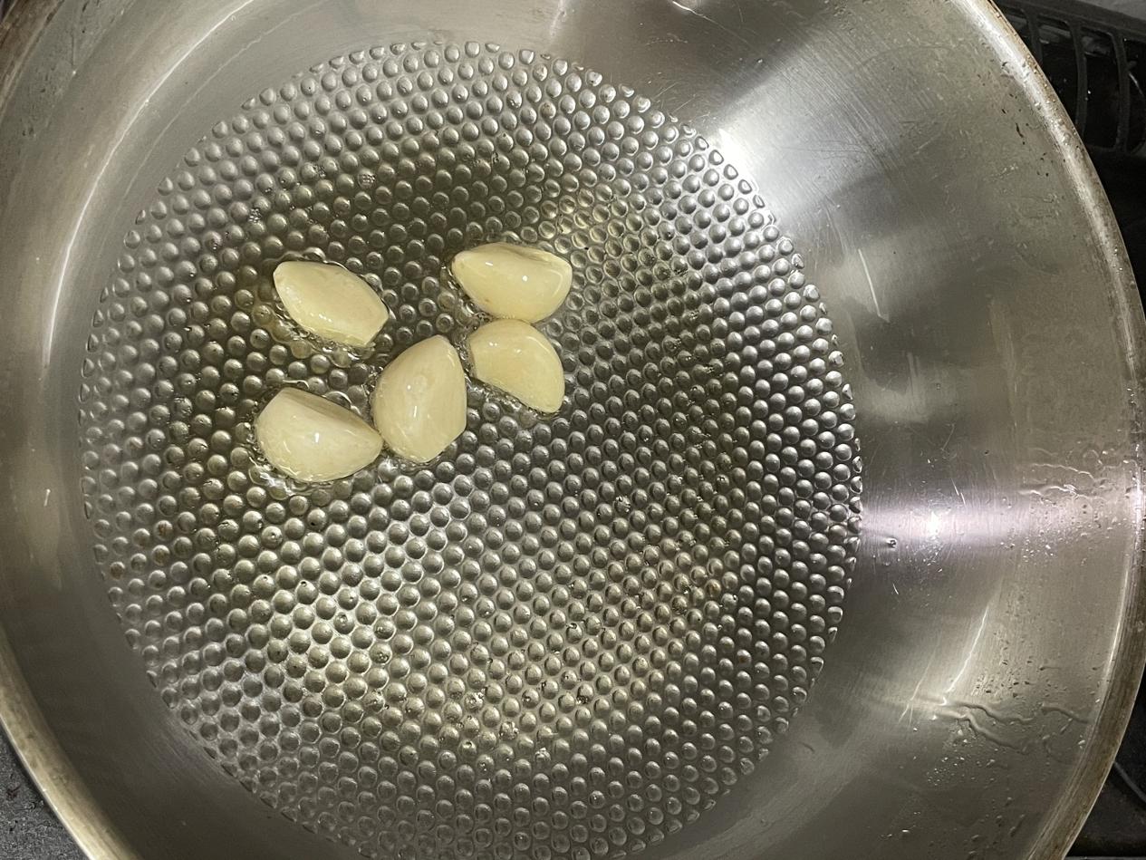 우선 프라이팬에 식용유를 두르고 통마늘을 볶습니다.