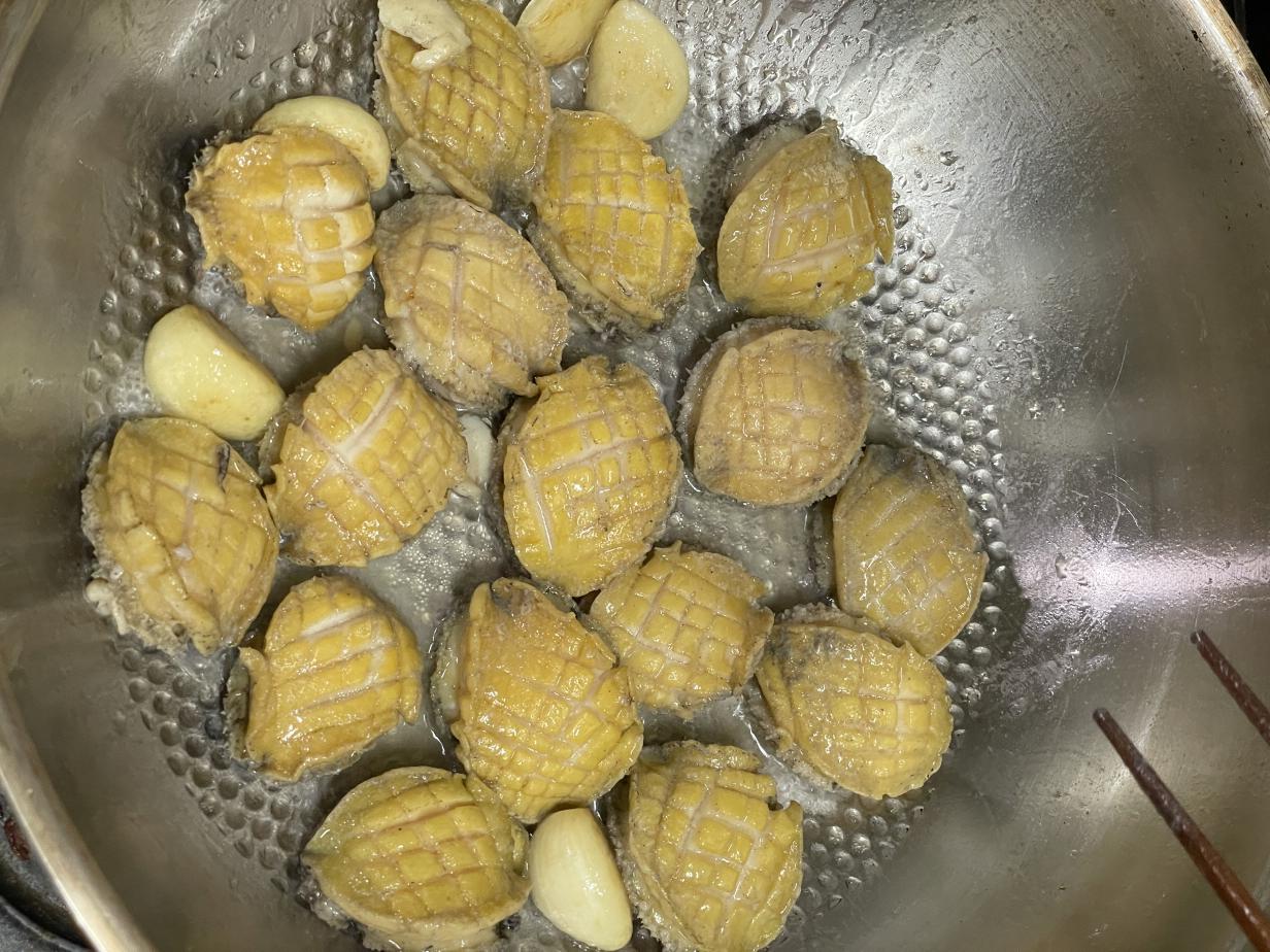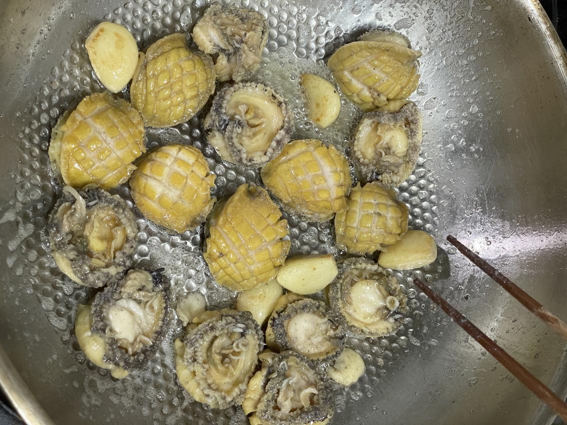 마늘이 노릇노릇해지면 손질된 전복을 넣어 익힙니다. 센 불에 1분 정도 익힙니다.