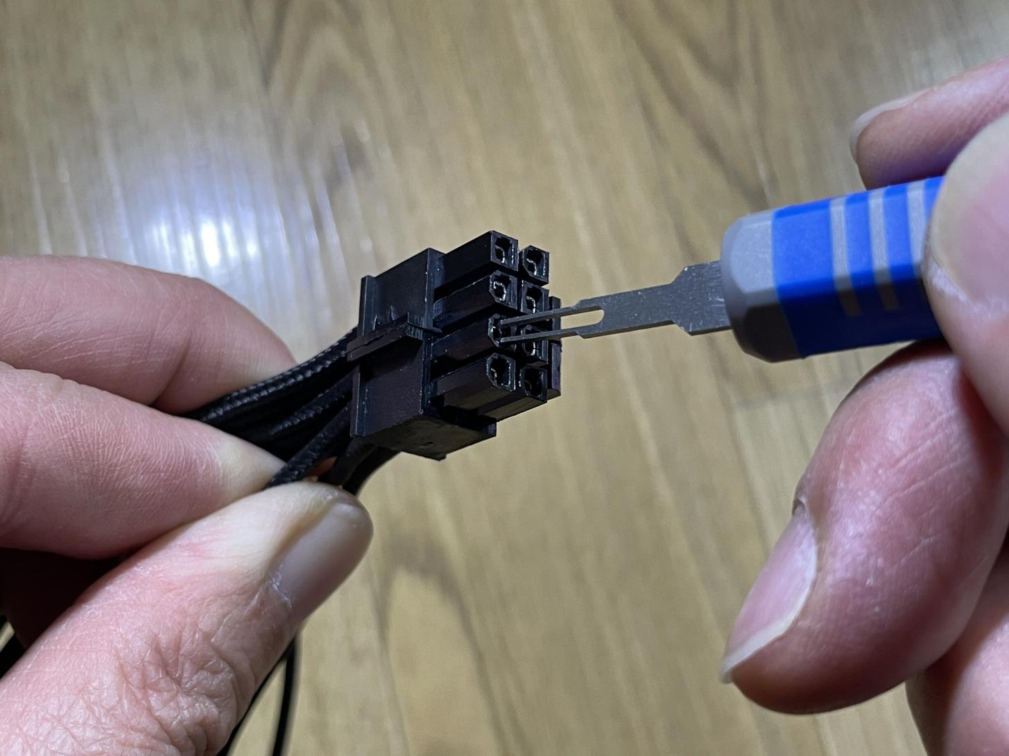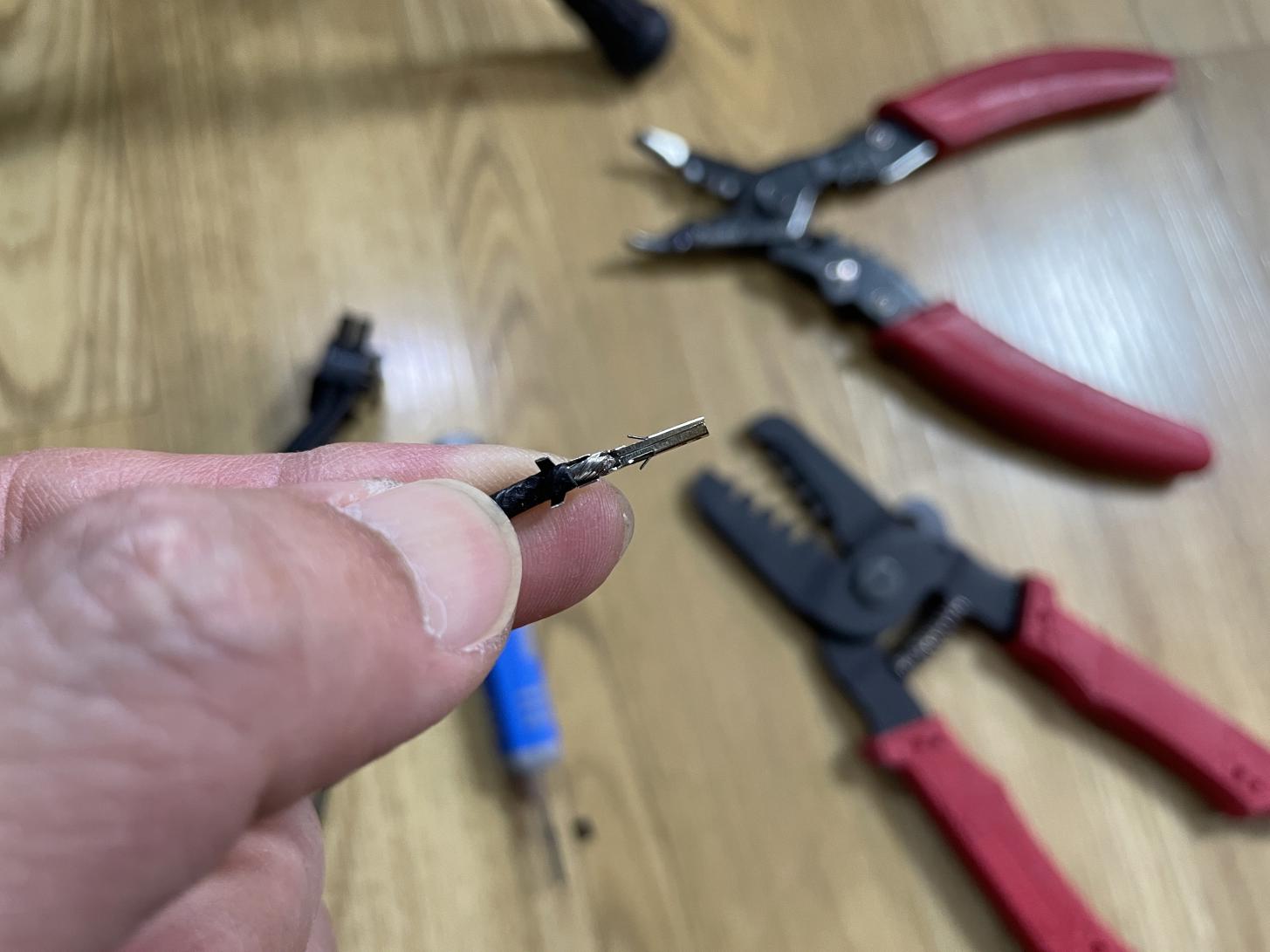 이 커넥터 핀의 규격은 5559라고 하는데요. 커넥터에 있는 기존 핀을 제거하고 잘라낸 전원선에 이 핀을 압착하여 만들어야 합니다.