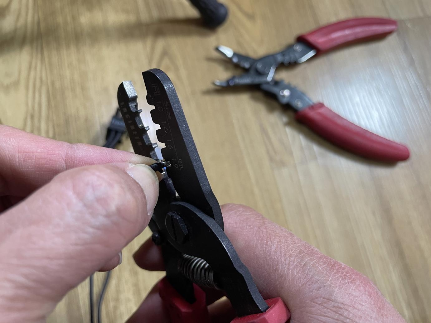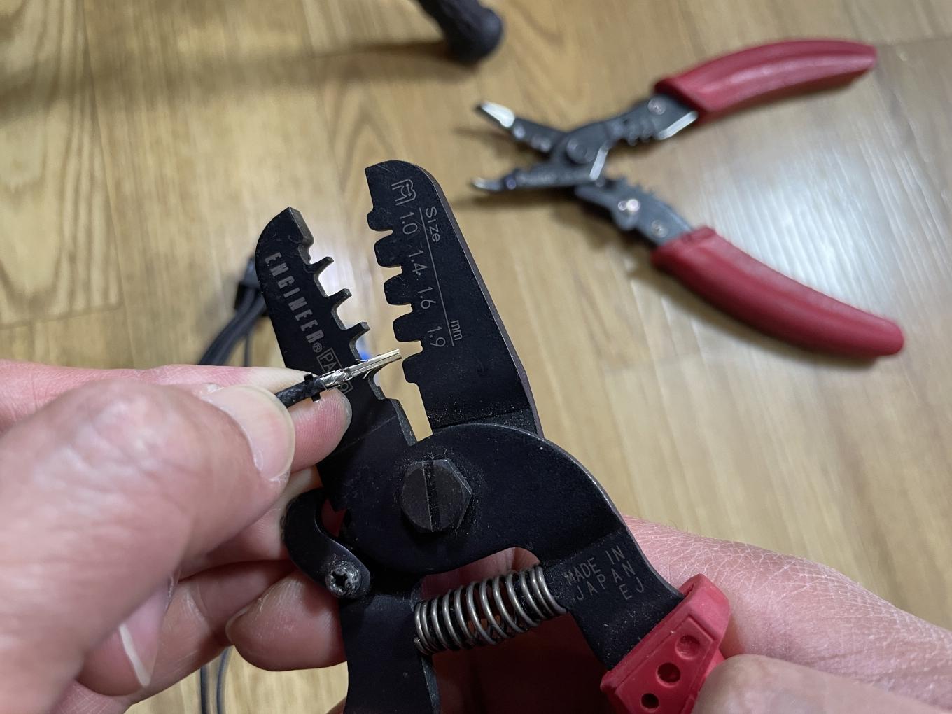 피복을 제거한 부분에 핀을 넣고 압착기로 압착합니다.