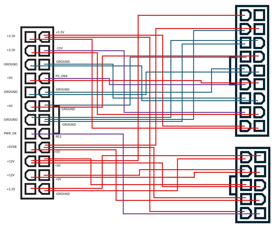 선을 자르기 전에 24핀 전원커넥터의 배선도와 선들의 용도를 알아야 해요. 그래서 아래와 같은 배선도를 정리해 봤어요.