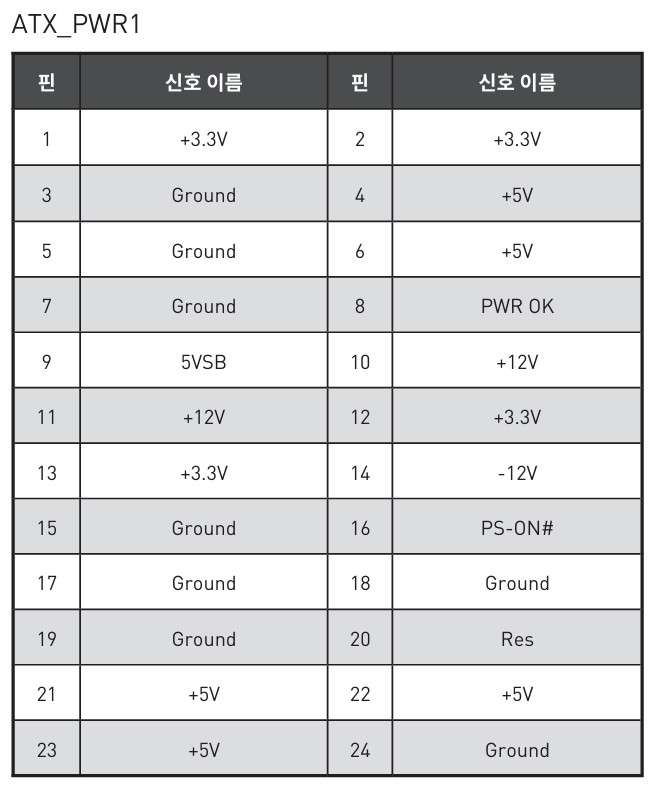 선을 자르기 전에 24핀 전원커넥터의 배선도와 선들의 용도를 알아야 해요. 그래서 아래와 같은 배선도를 정리해 봤어요.