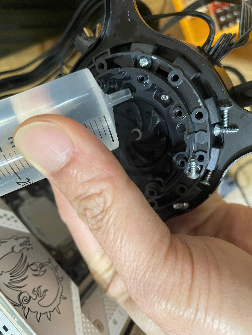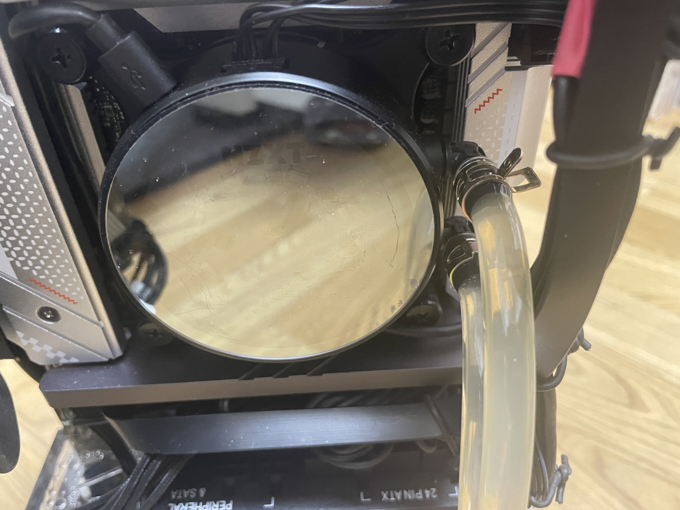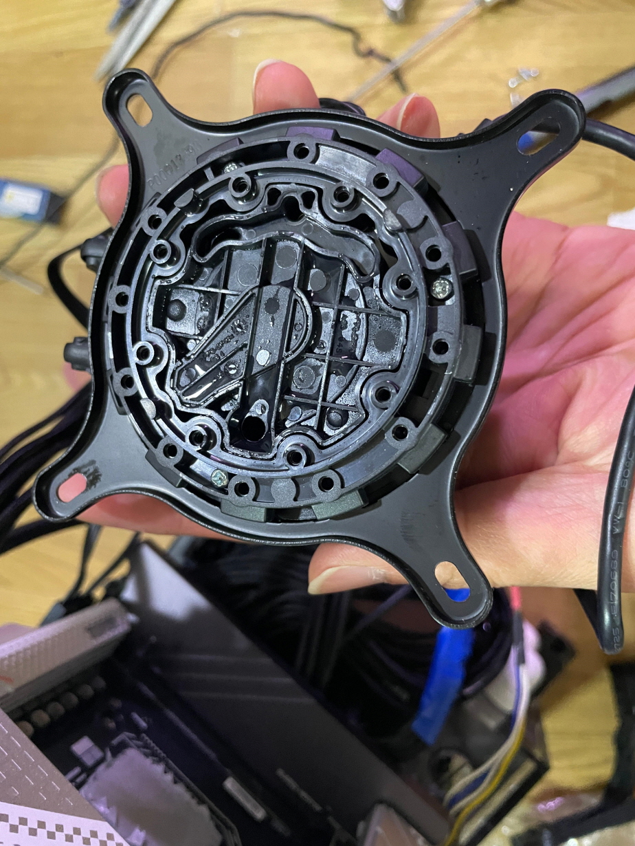 그래서 워터블록을 다시 뜯었습니다. 워터블록 안에 냉각수가 안 들어간 부분과 기포를 모두 제거하기 위해 주사기로 냉각수를 채웠어요. 기포를 제거한 워터블록을 CPU에 다시 장착하고 전원스위치를 켜니까 이제는 냉각수가 순환하며 정상 온도를 유지합니다.