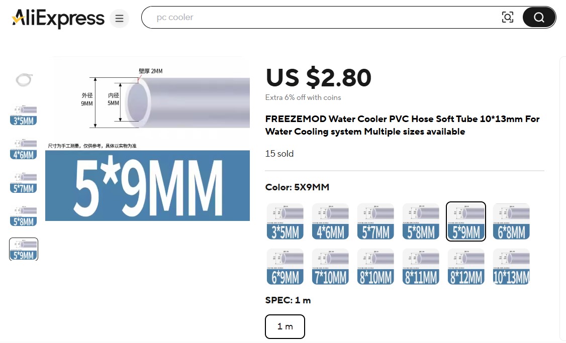 호스도 냉각수가 흐르는 모습이 보여야 하기 때문에 투명호스로 외경 9mm, 내경 5mm의 두께 2mm인 재료를 구매했습니다.