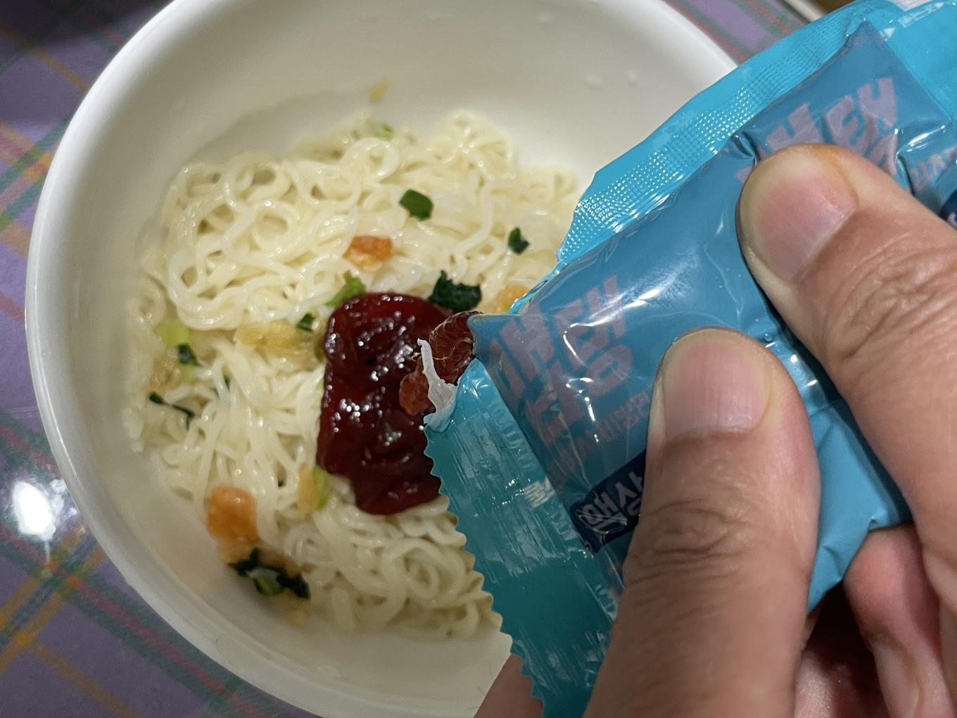 기본적으로 비빔면은 매운맛이기 때문에 매운 음식을 못 드시는 분은 액상스프의 양을 조절해서 드시면 됩니다.