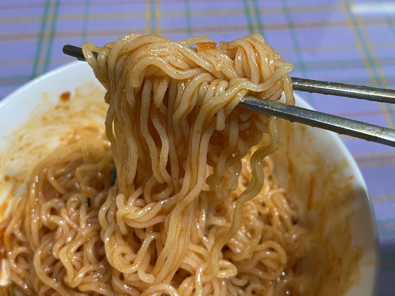 큐베브페퍼 오일 맛이 입안에서 화한 맛을 느끼게 되어 민트 맛이나 치약 맛과 비슷하다는 느낌을 받을 수 있지만 먹을수록 시원하고 신기합니다. 거부감이 들지 않을 정도로 한입 다 먹은 다음 삼키고 나면 느껴지는 화한 맛이 재미있네요. 일반적인 비빔면이 맵고 단맛이라면 맵탱 스파이시 비빔면은 맵고 시원한 맛이라고 할 수 있습니다. 여름에 많이 먹게 되는 비빔면을 더 시원하게 즐길 수 있게 만든 것 같아요. 액상스프의 고추장이 맵지만 마치 혀를 마비시켜 매운맛을 못 느끼게 하는 맛처럼 느껴집니다.