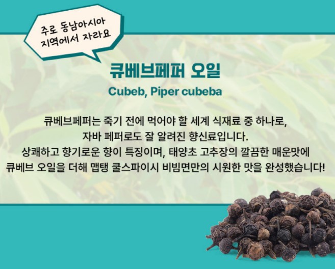 향기롭고 상쾌한 향이 나는 쿠베브페퍼는 죽기전에 꼭 먹어야 하는 세계 식재료 중 하나라고 하네요. 맵탱 쿨스파이시 비빔면의 액상스프에는 태양초 고추장과 큐베브 페퍼 오일을 섞어 만들었어요. 독특한 시원한 맛이 깔끔한 매운맛과 잘 어우러집니다.