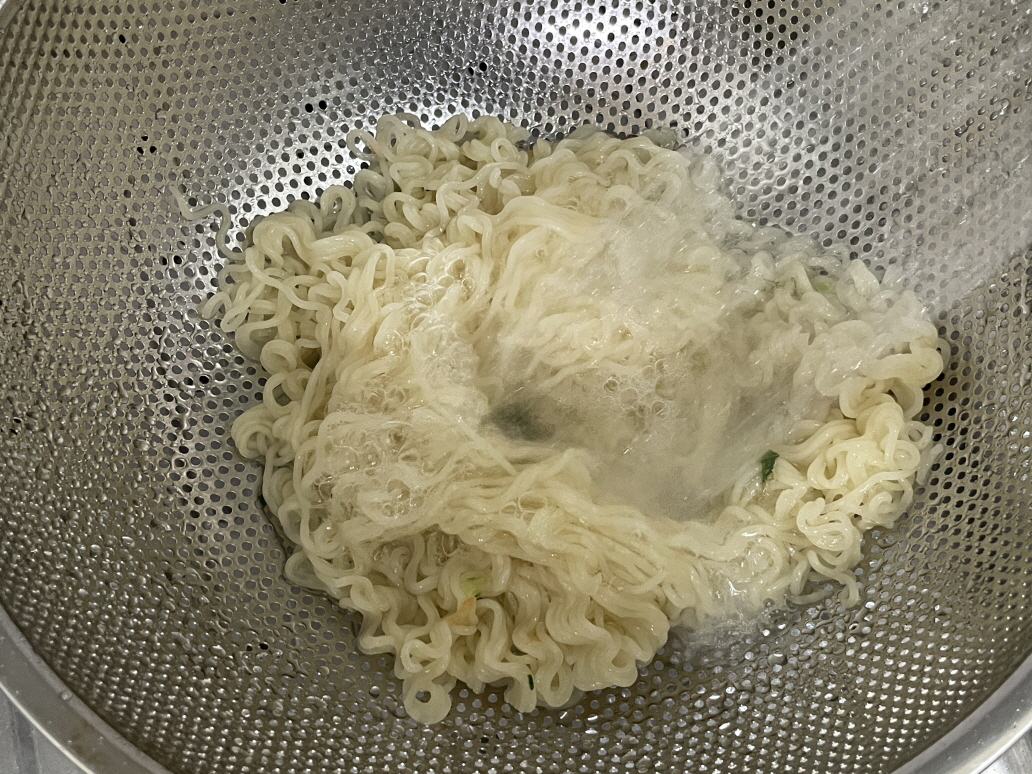 끓는물 600ml에 면과 후레이크 스프를 넣고 3분간 더 끓입니다.