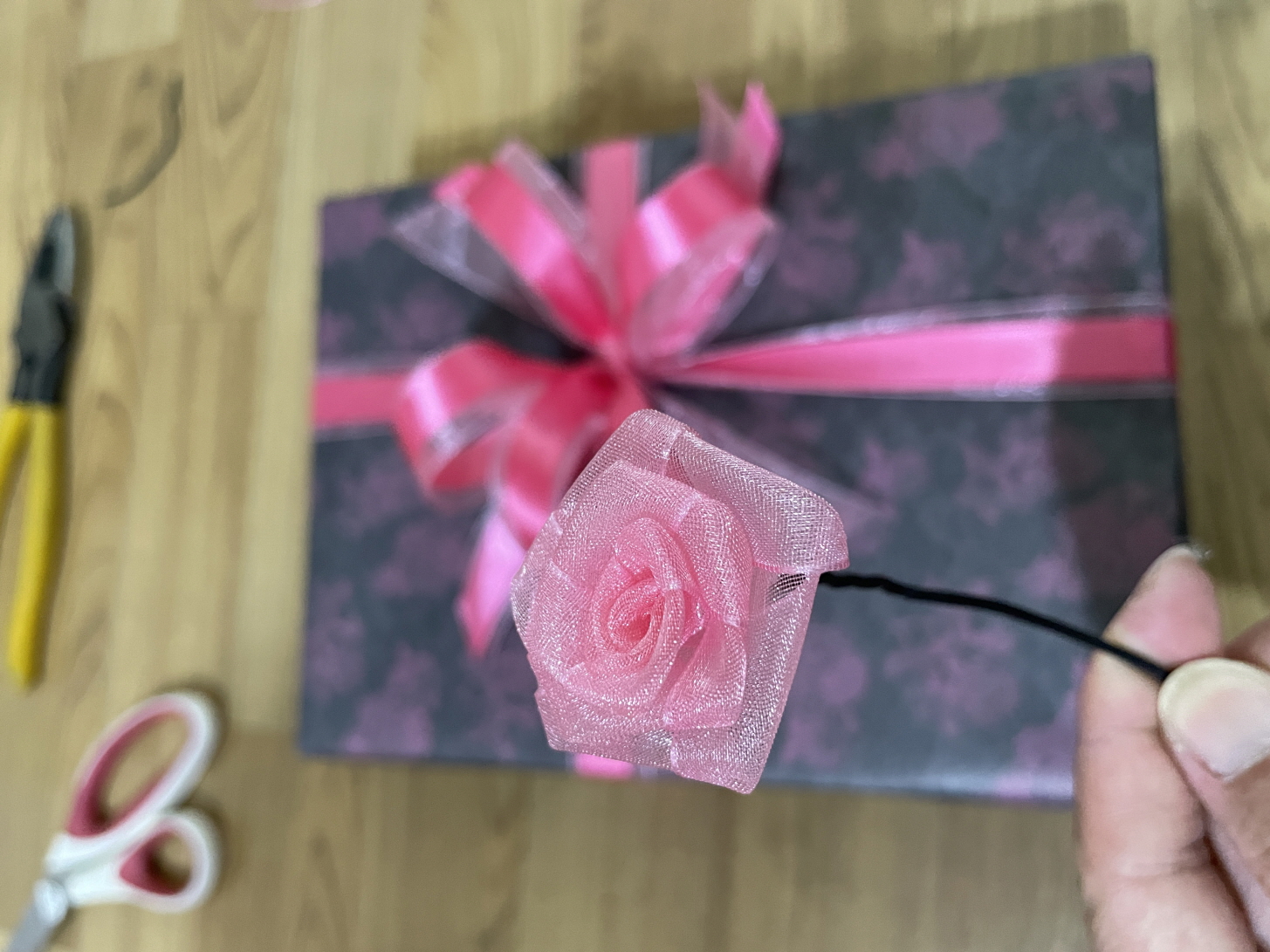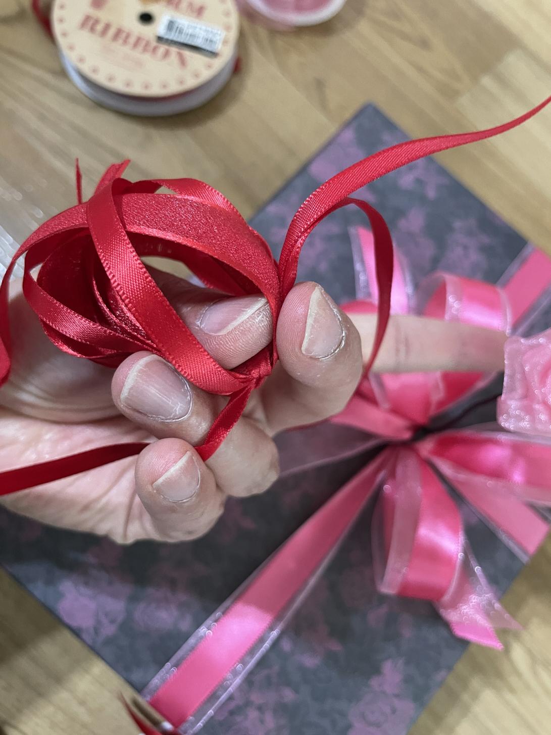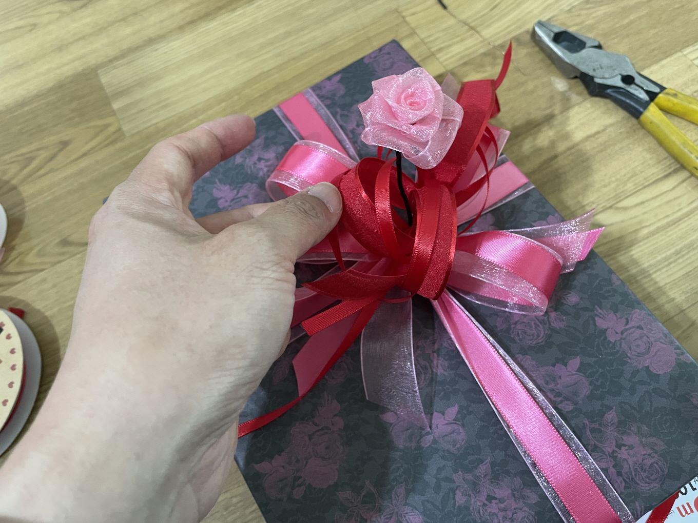 장미 한 송이만 하면 허전하니까 빨간색 리본으로 장미 주변을 추가로 장식해 줍니다.