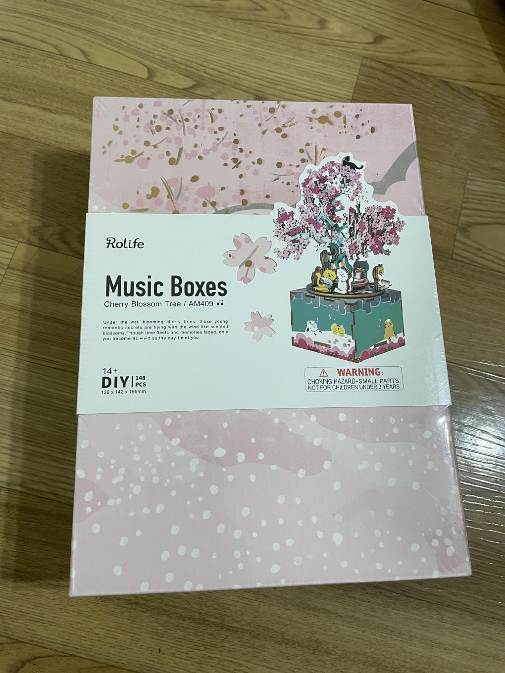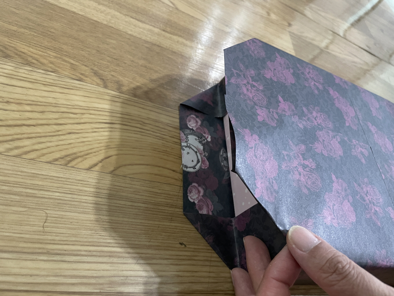 선물은 조립식 뮤직 박스입니다. 이 제품은 각진 박스모양의 선물이기 때문에 포장지로 먼저 포장합니다.