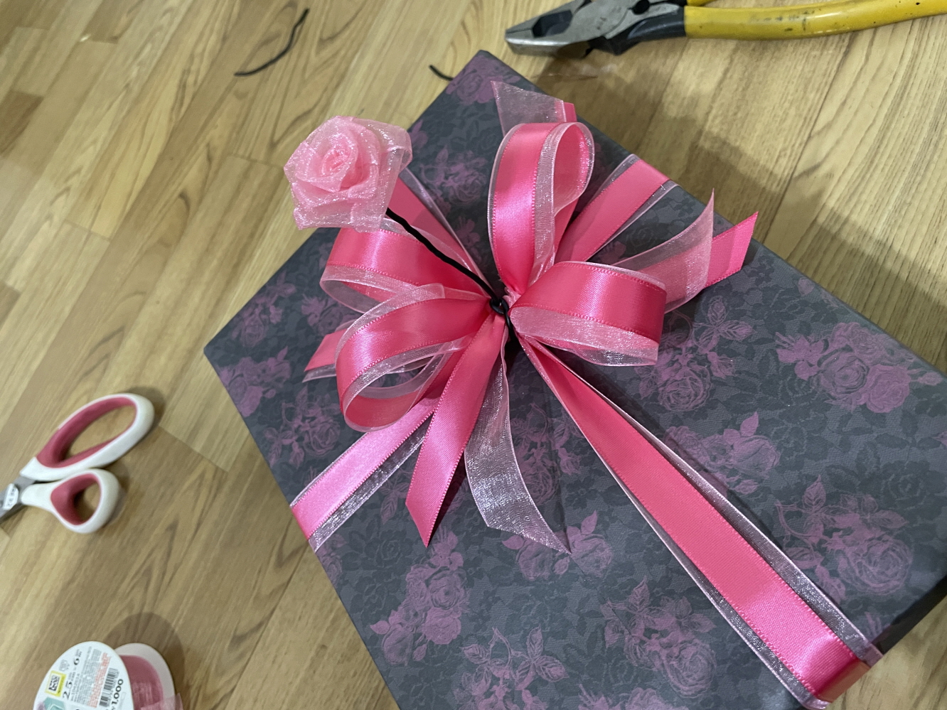 포장지가 검정 바탕에 어두운 핑크색 모양이기 때문에 핑크색 계열의 리본을 사용했어요. 리본색상 선정은 포장지와 어울리는 색상으로 묶어야 해요.