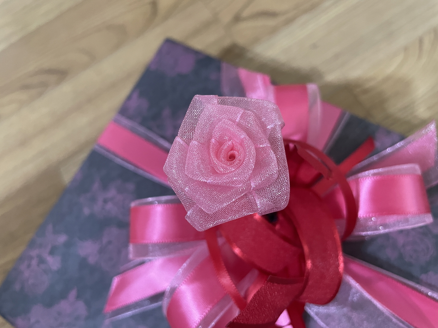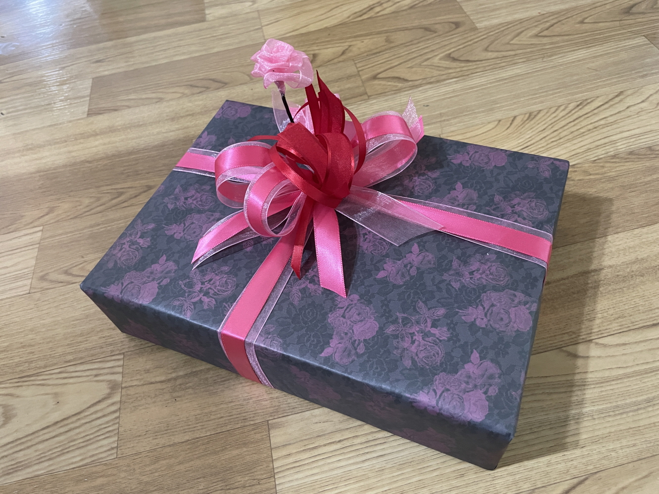 어때요? 어두운 색상 포장지와 핑크색의 리본이 잘 어울리는 것 같아요.