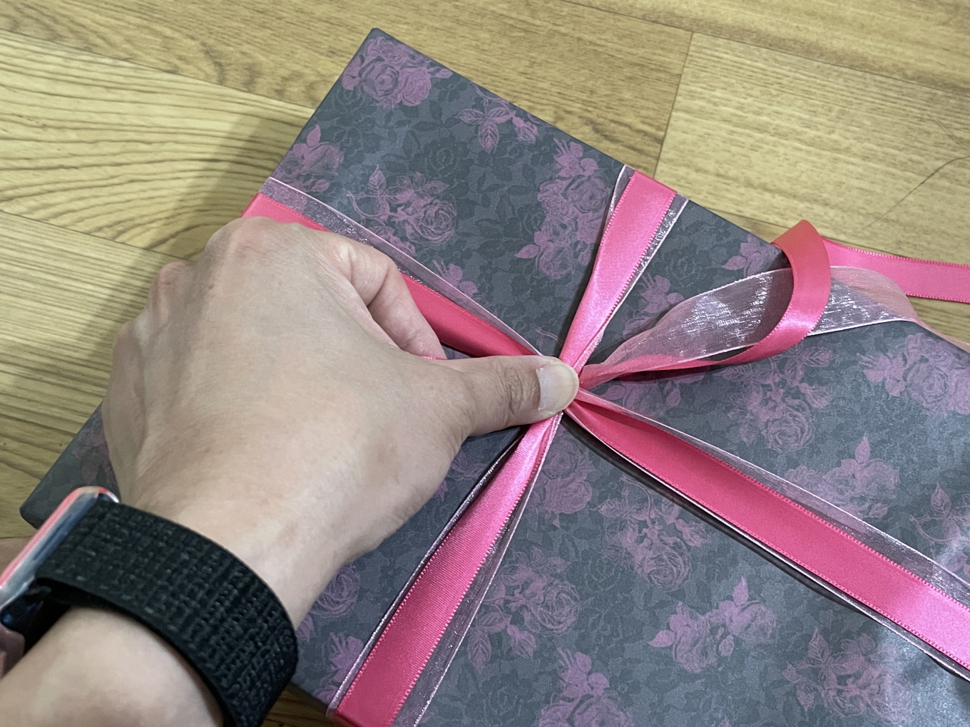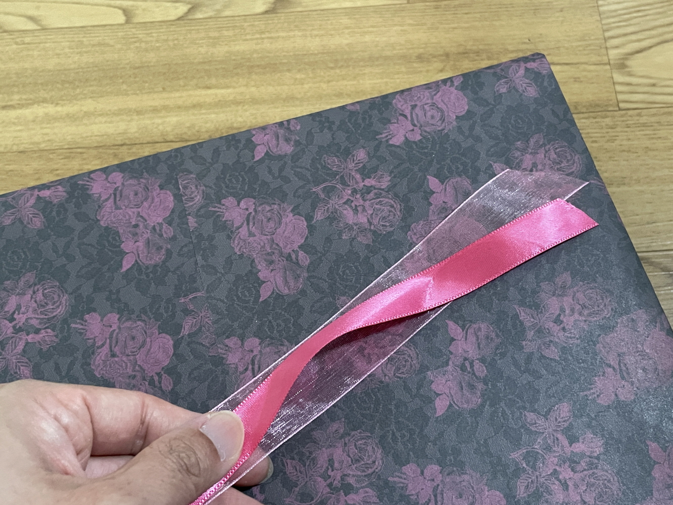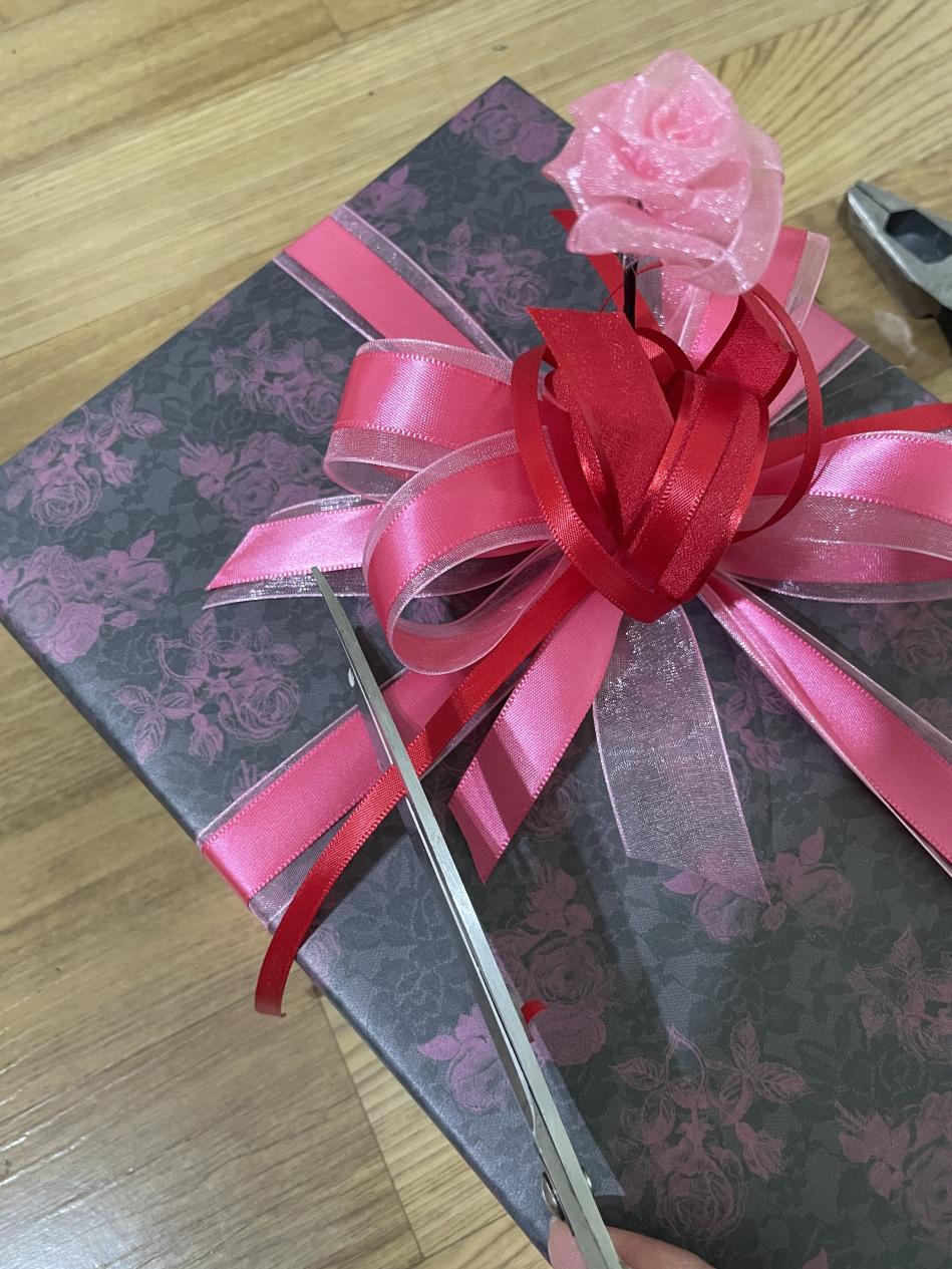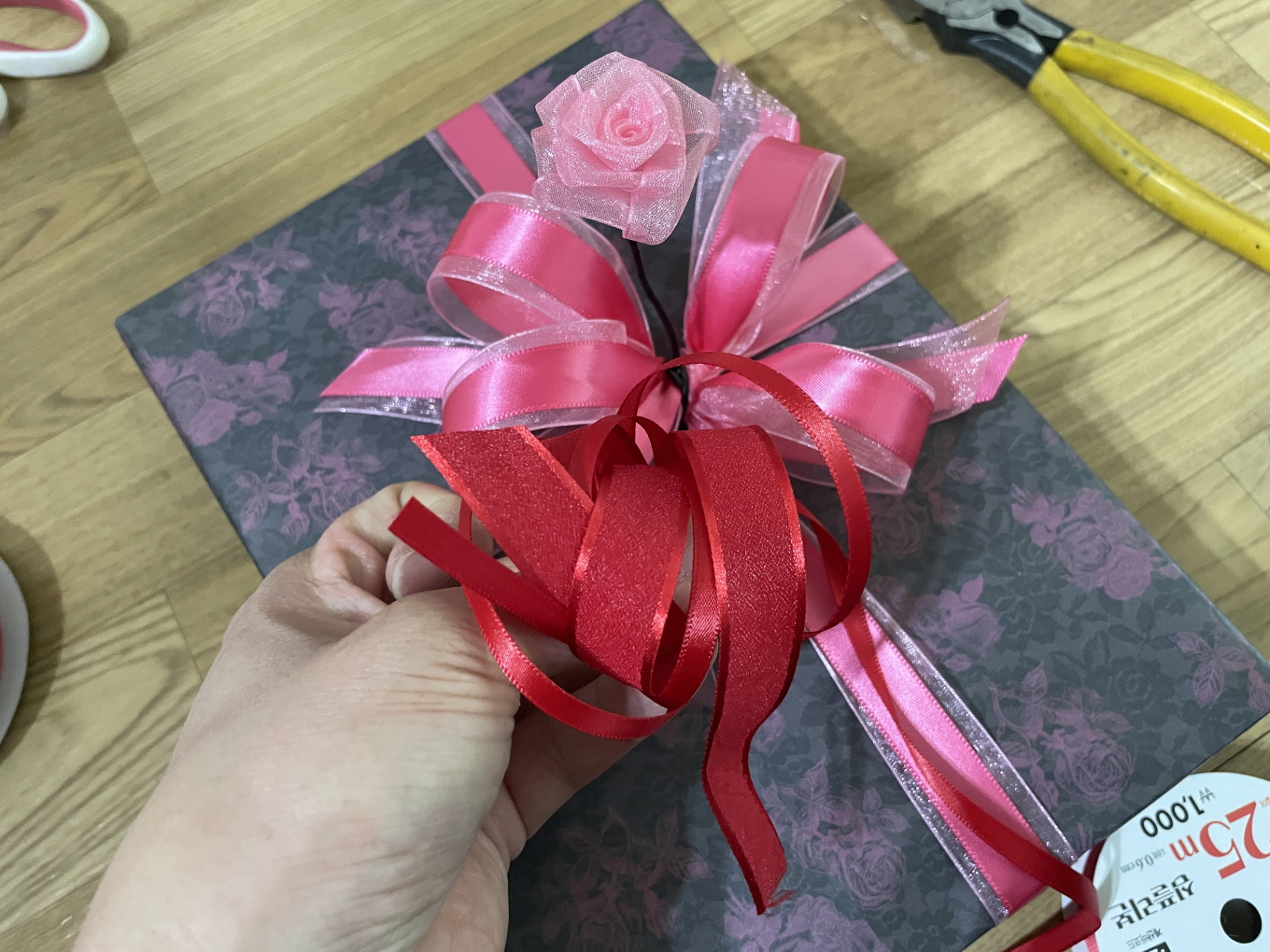 포장지가 검정 바탕에 어두운 핑크색 모양이기 때문에 핑크색 계열의 리본을 사용했어요. 리본색상 선정은 포장지와 어울리는 색상으로 묶어야 해요.