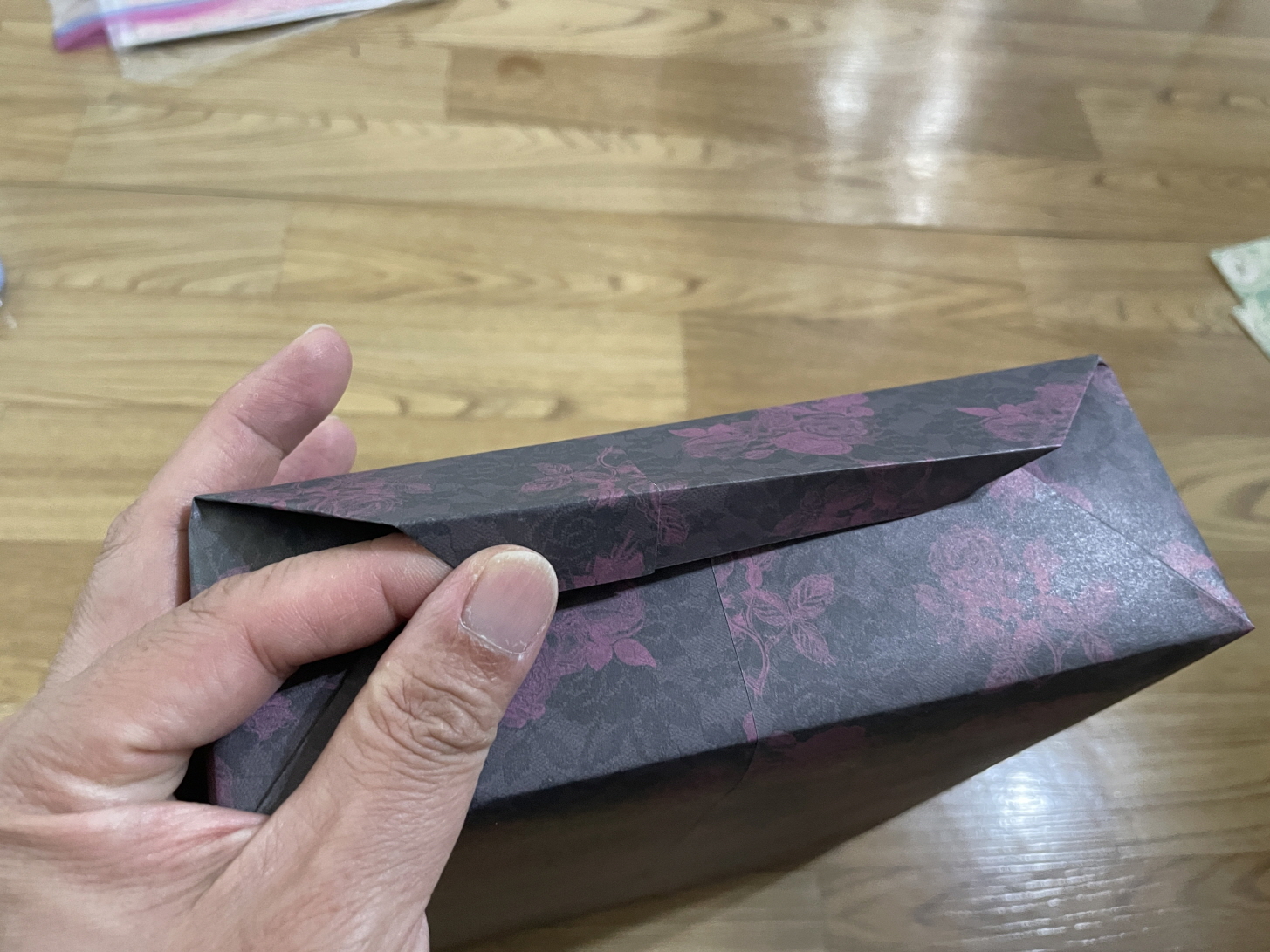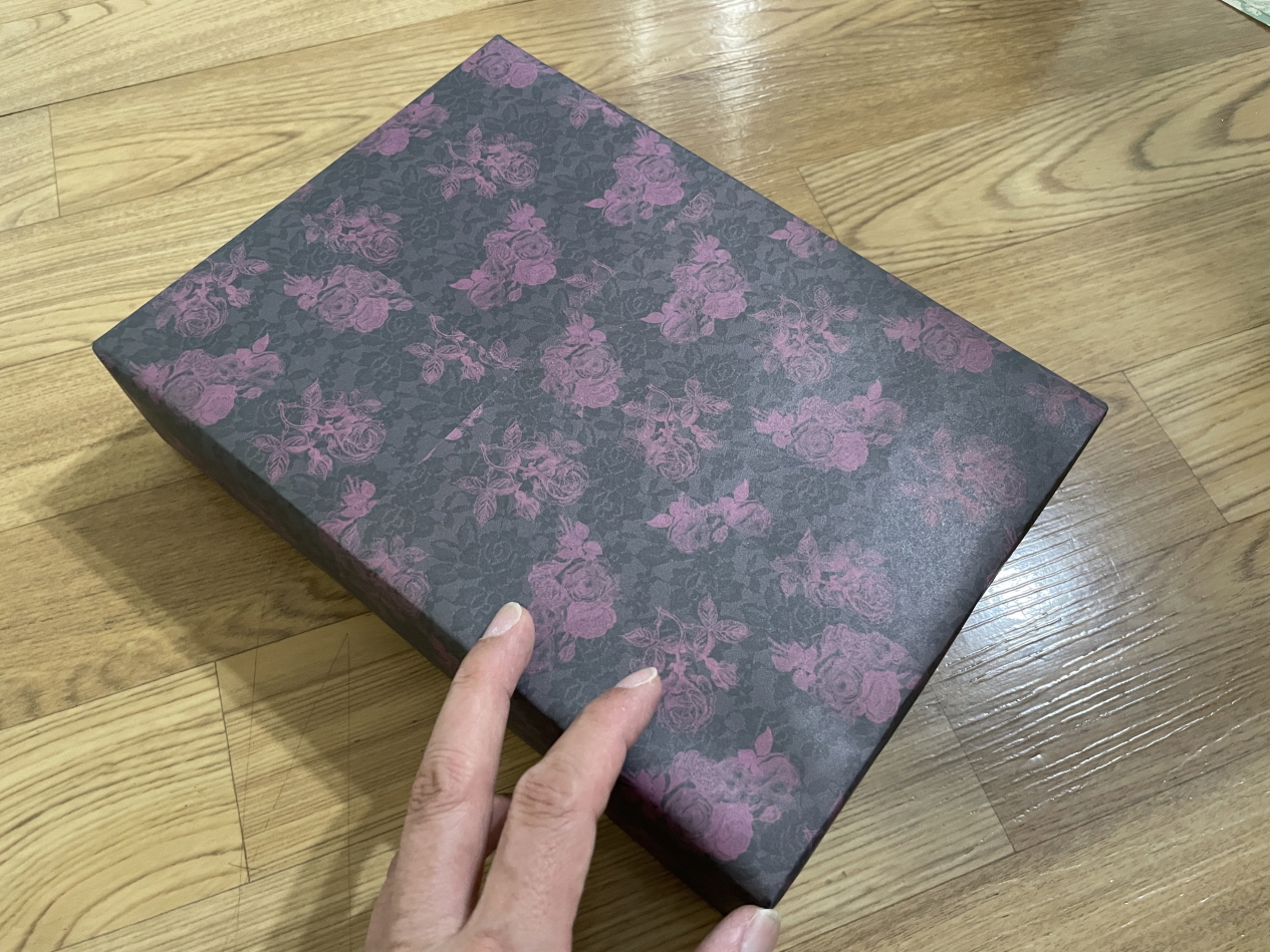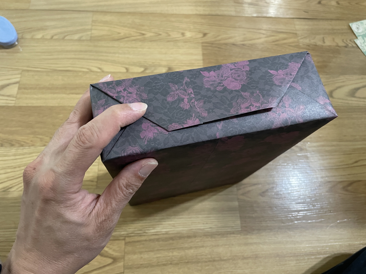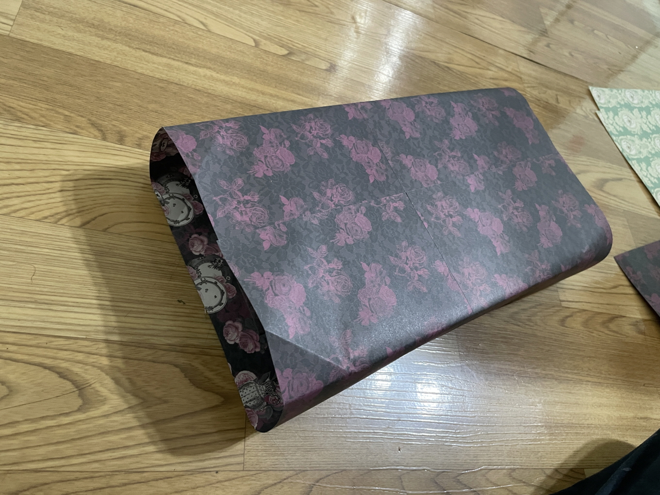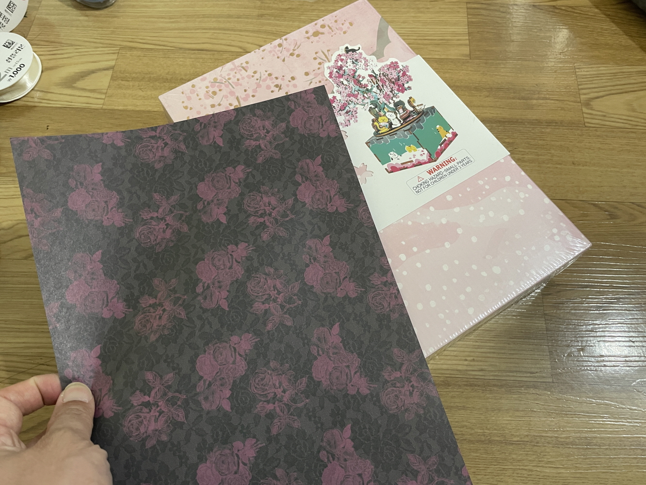선물은 조립식 뮤직 박스입니다. 이 제품은 각진 박스모양의 선물이기 때문에 포장지로 먼저 포장합니다.