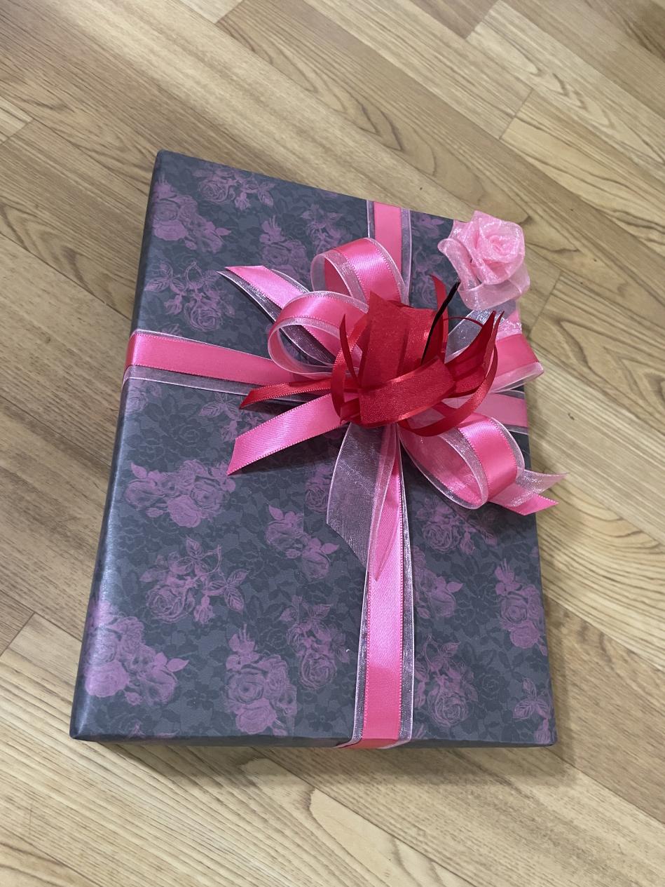 어때요? 어두운 색상 포장지와 핑크색의 리본이 잘 어울리는 것 같아요.