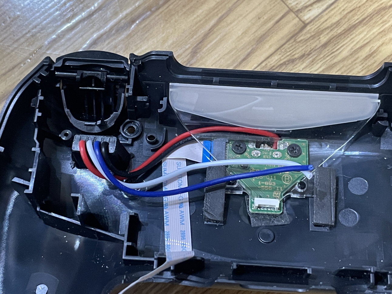 듀얼쇼크의 뒷부분에 공간의 여유가 있을만한 부분에 구멍을 뚫어줍니다. 드릴로 구멍 두 개를 뚫은 다음 그 사이를 따서 충전포트 들어갈 수 있도록 칼과 줄을 이용해서 깎아냅니다.
