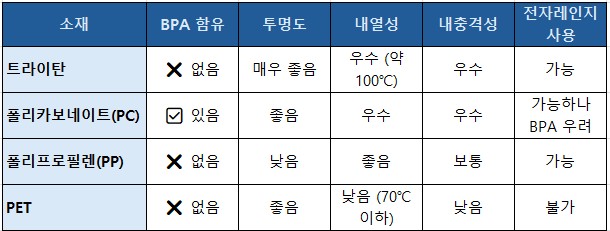일상 속에서 물병, 텀블러, 이유식 용기, 반찬통 등을 구매할 때 가장 많이 고민하는 요소 중 하나는 소재의 안전성입니다. 특히 아이가 있는 가정이라면 더더욱 그렇죠. 오늘은 환경호르몬 걱정 없는 신소재, 바로 트라이탄(Tritan)에 대해 소개해 드릴게요. 하지만 트라이탄이라고 환경호르몬에 대해 100% 신뢰할 수 있는 것은 아닙니다. 글을 끝까지 읽어주세요.