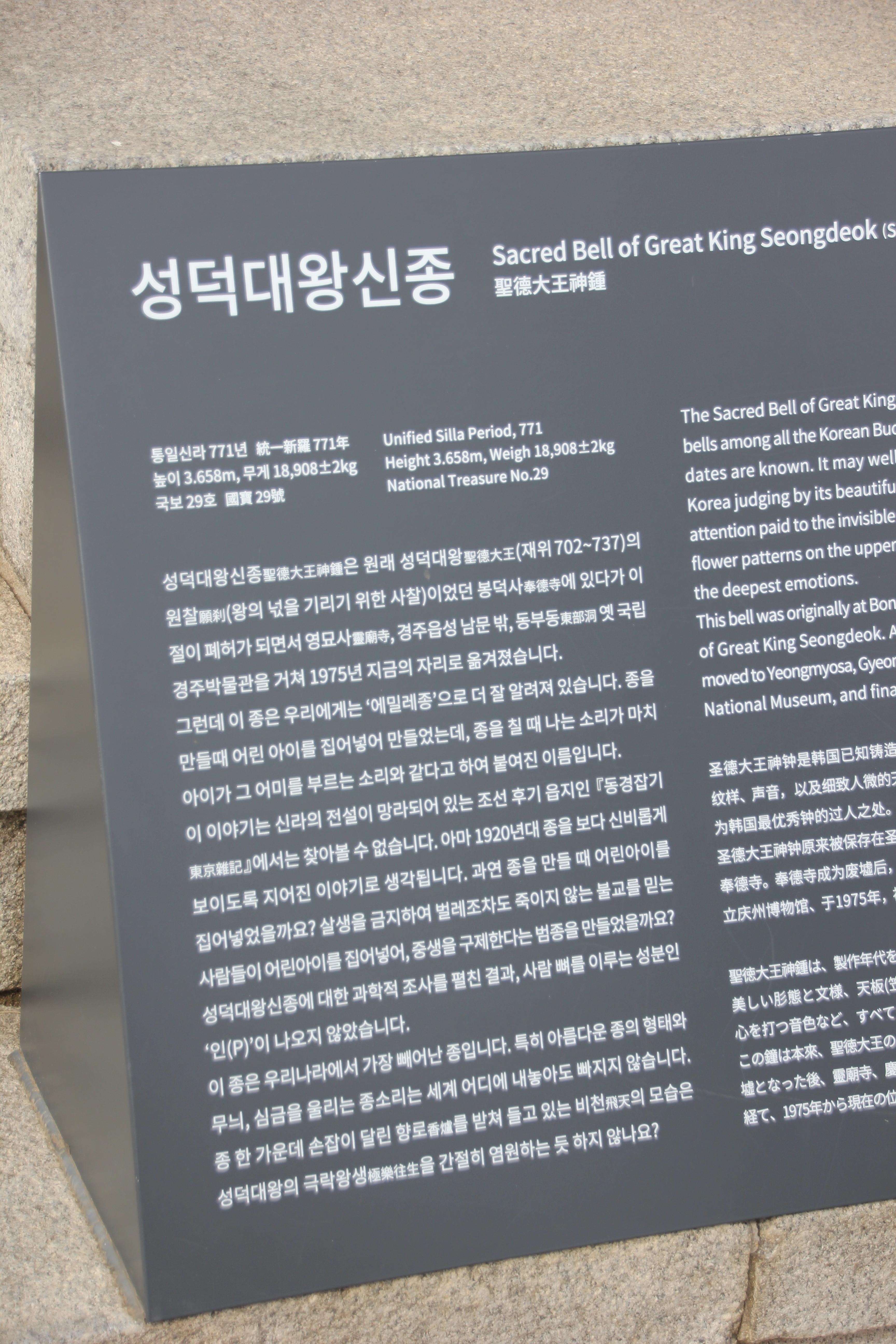 국립경주 박물관 입구로부터 들어와서 오른쪽으로 가면 거대한 종이 있는데 에밀레종으로 잘 알려져 있는 성덕대왕신종입니다.