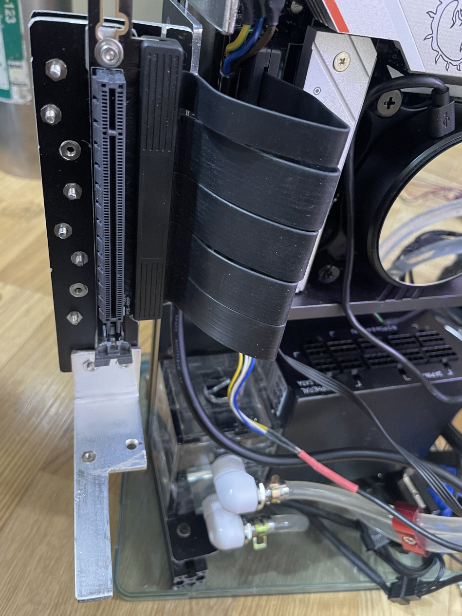 그래픽카드는 메인보드에 직접 장착하지 않고 라이저 카드를 사용해서 메인보드와 수평으로 설치했어요.