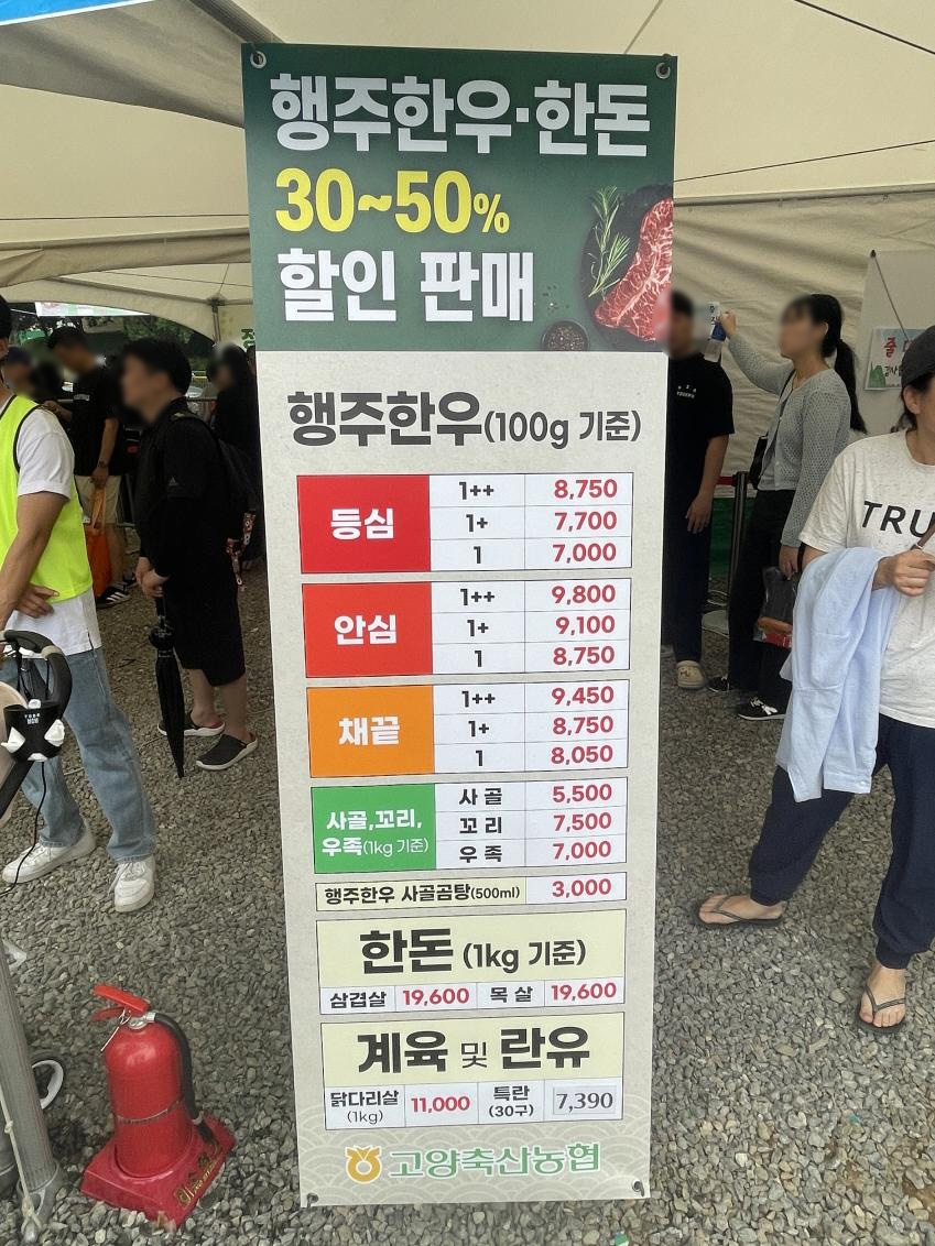 그리고 한우와 한돈을 30~50% 할인판매 해요. 고기 사가는 사람 많더라고요. 오늘 저녁에 먹을 고기를 미리 사가는 사람들인 것 같네요.