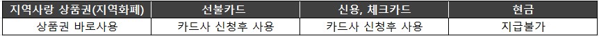 지급수단으로는 지역사랑 상품권과 선불카드, 신용, 체크카드로 지급되는데요.