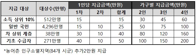 수급대상에 대한 구분은 이미 되어있어서 1차 지급분은 신속하게 이루어질 텐데요. 7월 첫째 주 추경안 국회 본회의 통과 후 2주 뒤 지급될 예정입니다. 1차 지급은 7월 중순쯤 지급될 것 같은데요. 여름휴가 전, 후가 되겠네요. 그리고 2차 쿠폰은 소득 상위 10%를 제외한 전 국민에게 추가로 10만 원씩 지급되는데요 선별작업에 시간이 지연될 것으로 예상됩니다. 2차 지급분은 소득상위 10% 건강보험료 기준 선별되는데요. 부모가 소득 상위 10%에 해당되면 자녀(피부양자)도 받지 못합니다.